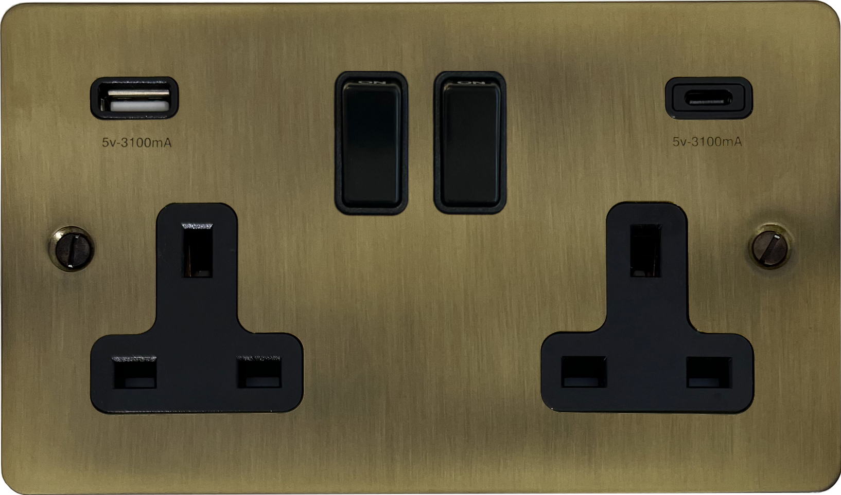 Flat Light Antique Brass Socket with USB (2 Gang/USB-A and USB-C/Black Switches) FL.911B.LAB