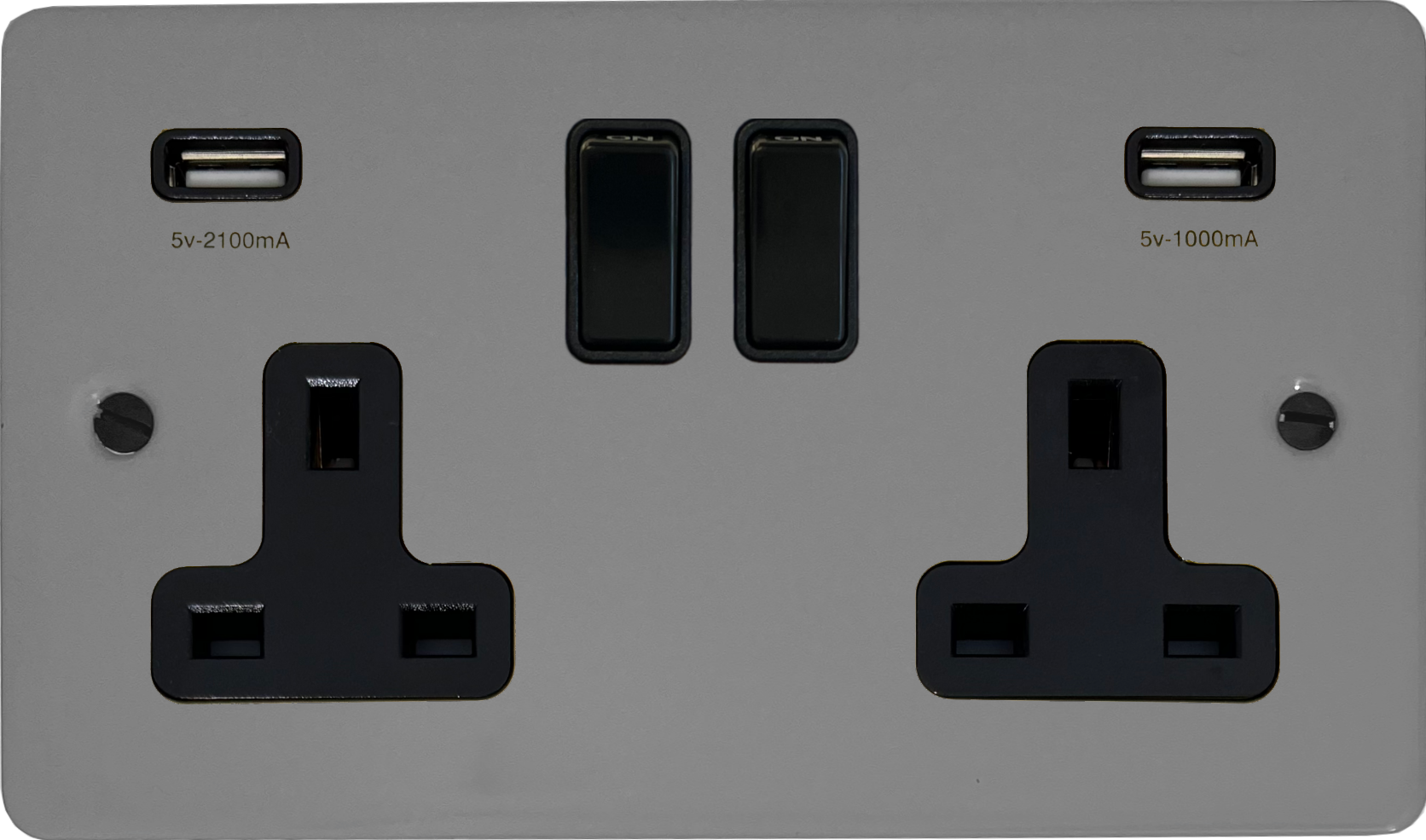 Flat light grey Double Socket with USB (Black Switches) - FLG910B