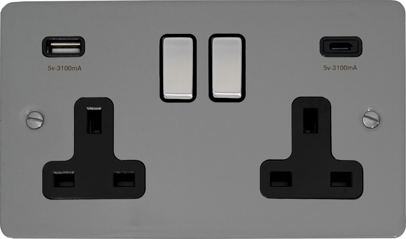 Flat light grey Double Socket with USB (USB-A and USB-C/Black Insert/Metal Switches) FL.3911.LG