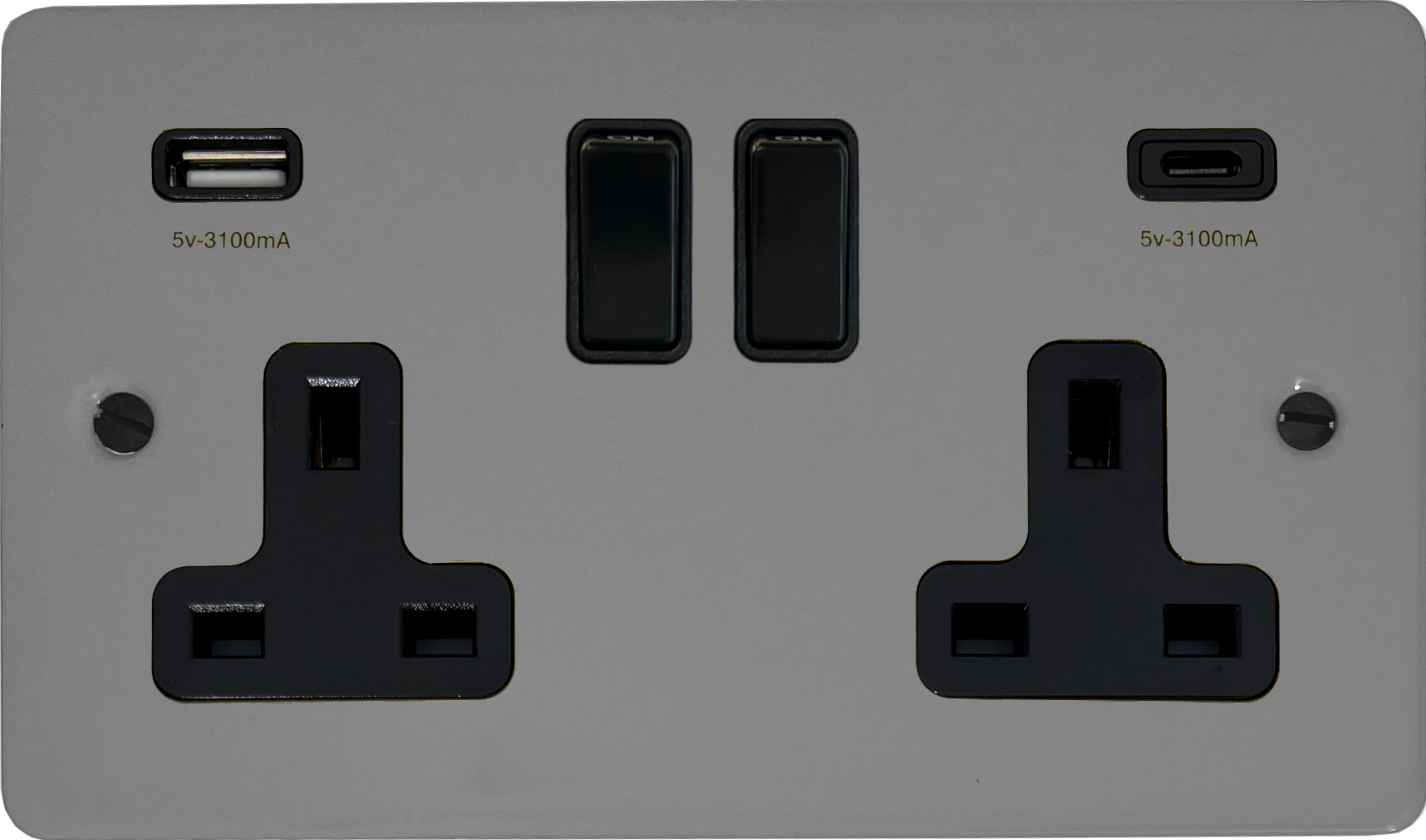 Flat light grey Double Socket with USB (USB-A and USB-C/Black Switches) FL.911B.LG