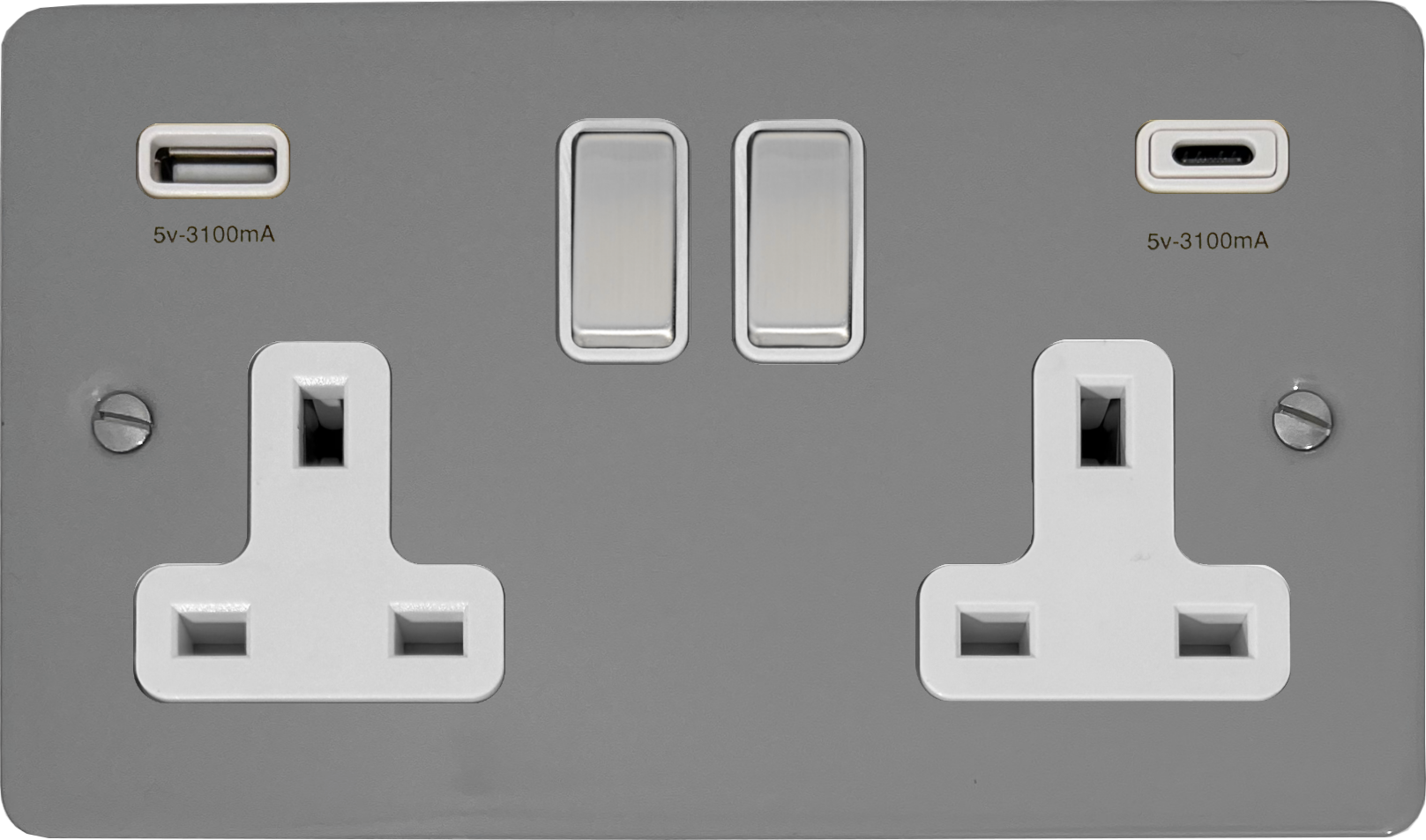 Flat light grey Double Socket with USB (USB-A and USB-C/White Insert/Metal Switches) FL.2911.LG