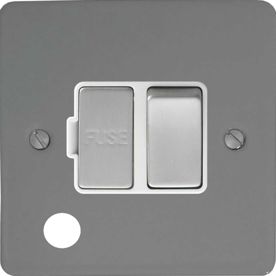 Flat light grey Switched Fused Spur with Flex Outlet (White Insert/ Metal Switch) - FLG256