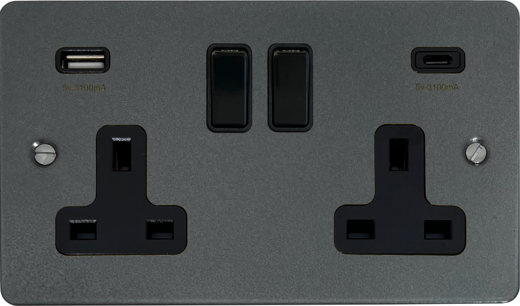 Flat Pewter Double Socket with USB (2 Gang/USB-A and USB-C/Black Switch) FL.911B.P