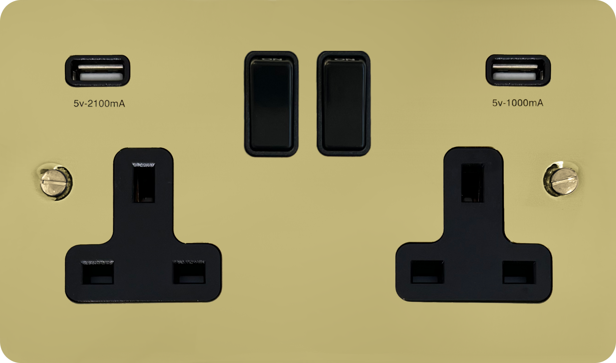 Flat Polished Brass Double Socket with USB (Black Switches) FL.910B.B