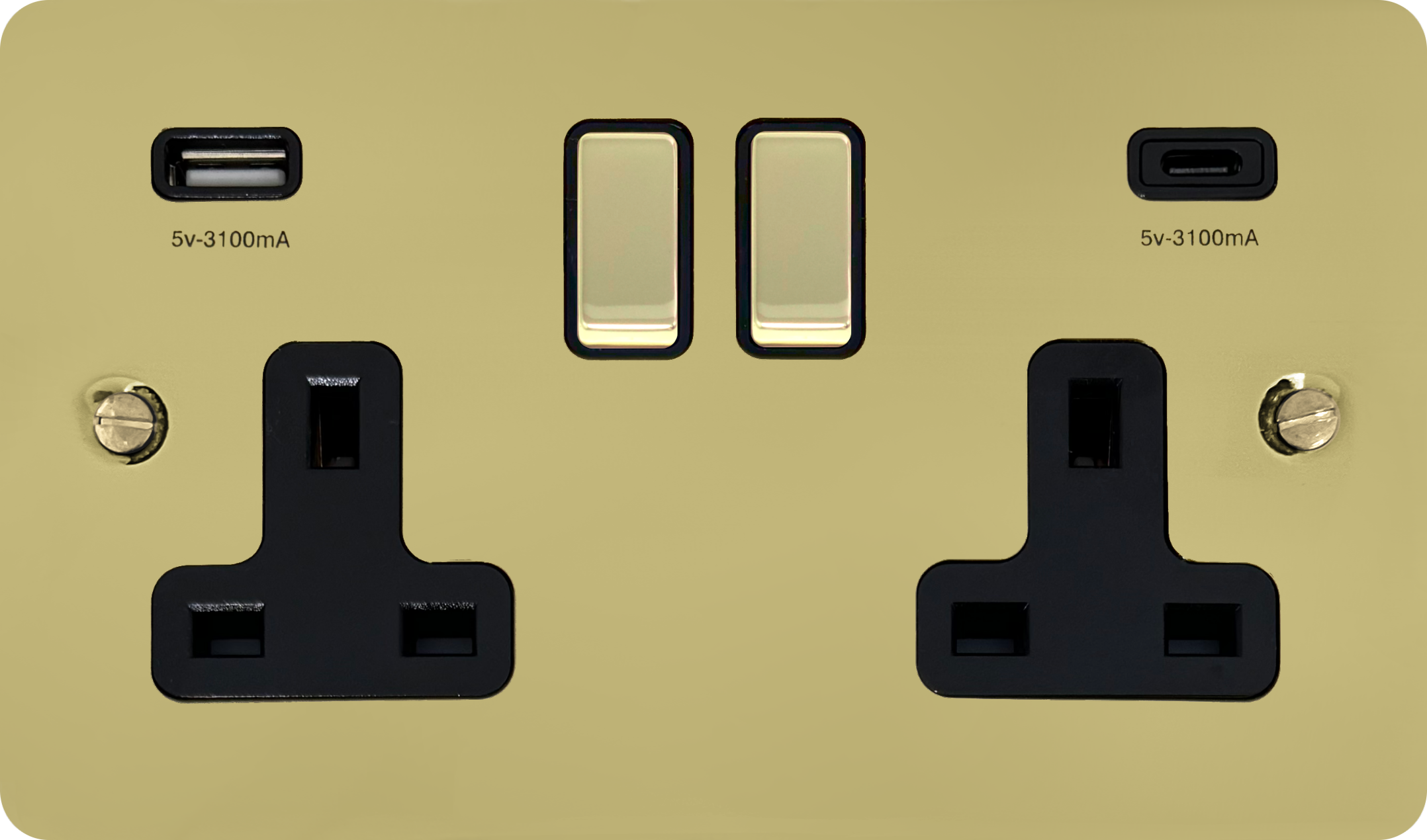 Flat Polished Brass Double Socket with USB (USB-A and USB-C/Black Inserts Brass Switches) FL.3911.B