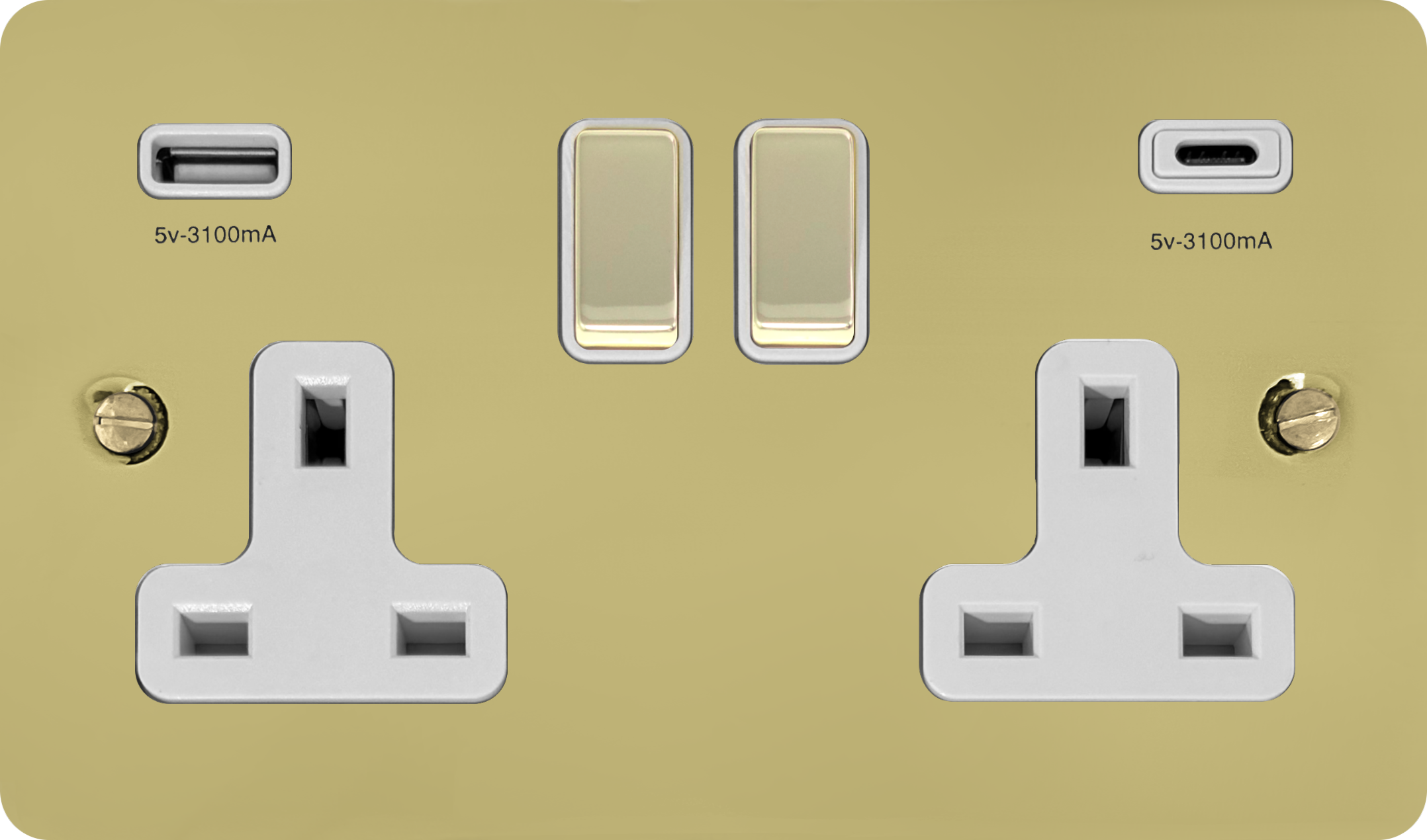 Flat Polished Brass Double Socket with USB (USB-A and USB-C/White Inserts Brass Switches) - FB2911