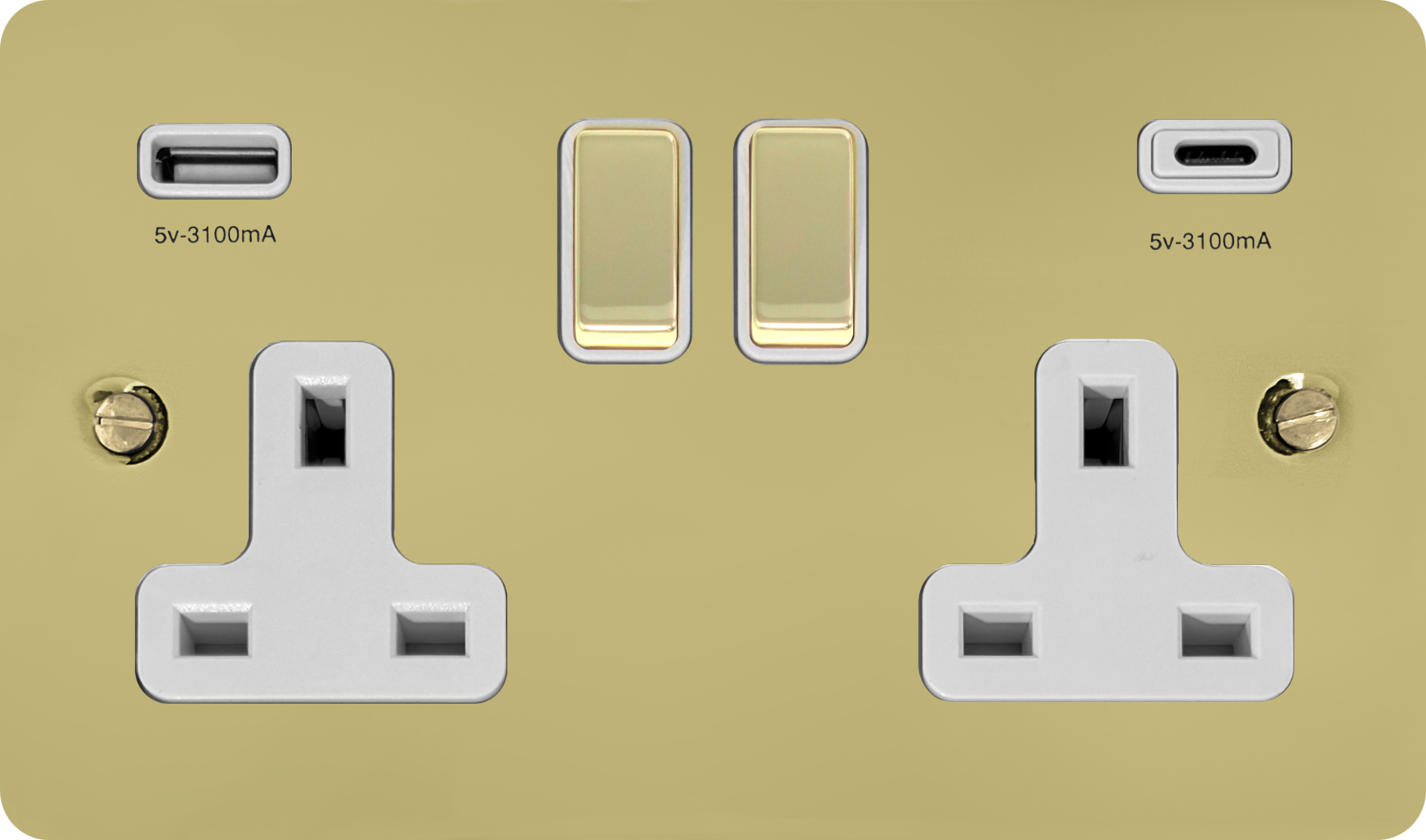 Flat Polished Brass Double Socket with USB (USB-A and USB-C/White Inserts Brass Switches) FL.2911.B