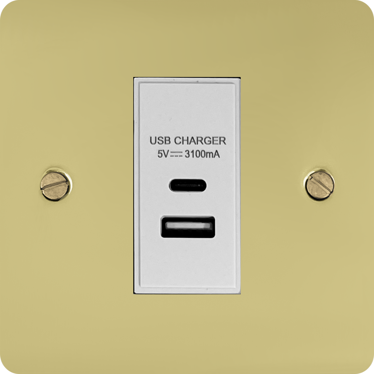 Flat Polished Brass Hand Waxed USB Charger (USB-A and USB-C) (1 Gang/White Insert) FL.41W.HX