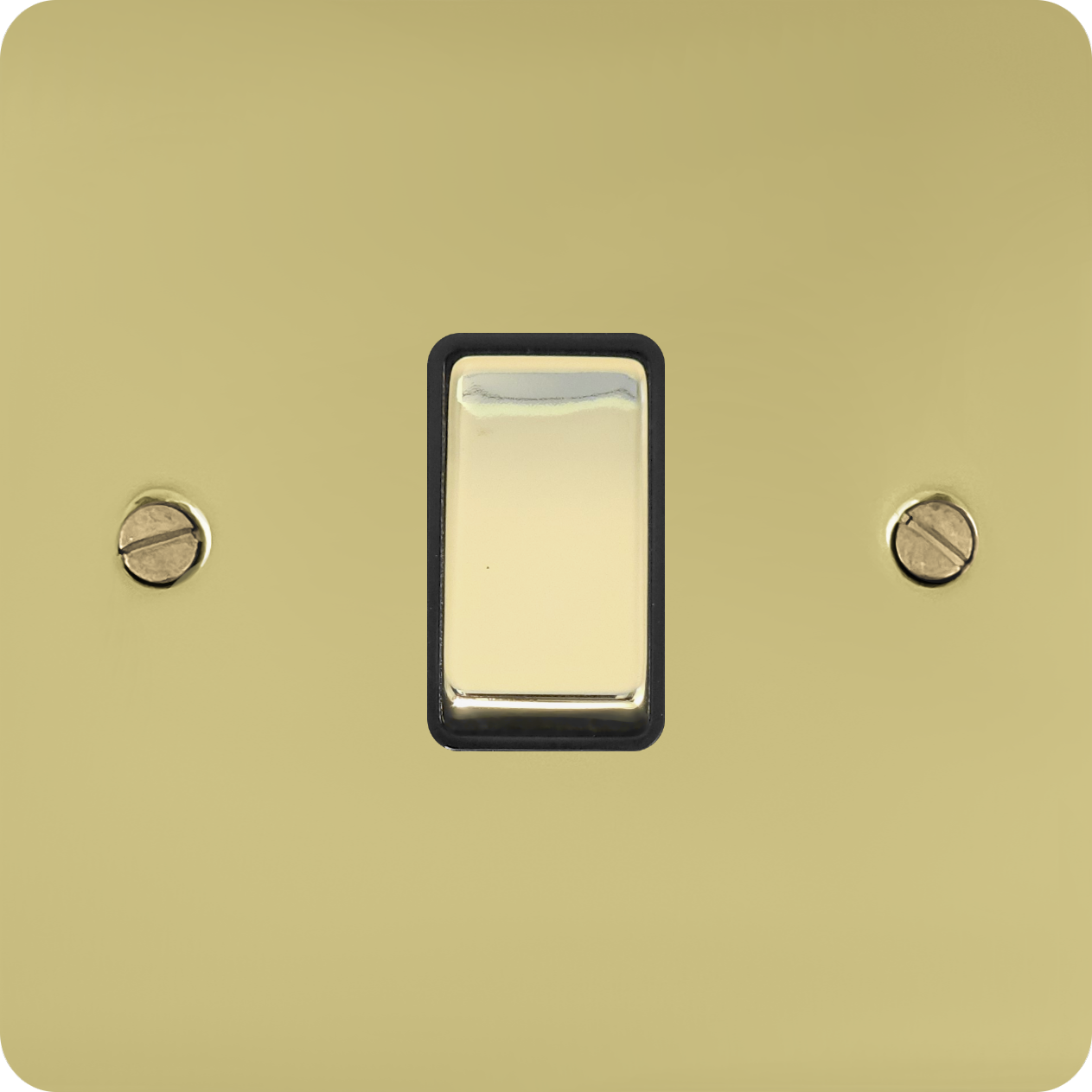 This is a one gang intermediate light switch with a polished brass switch on a flat polished brass plate.