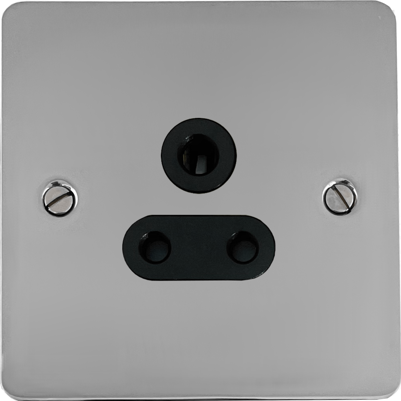 This is a 1 Gang 5A Round Pin Socket with Black inserts on a flat Polished Chrome plate.