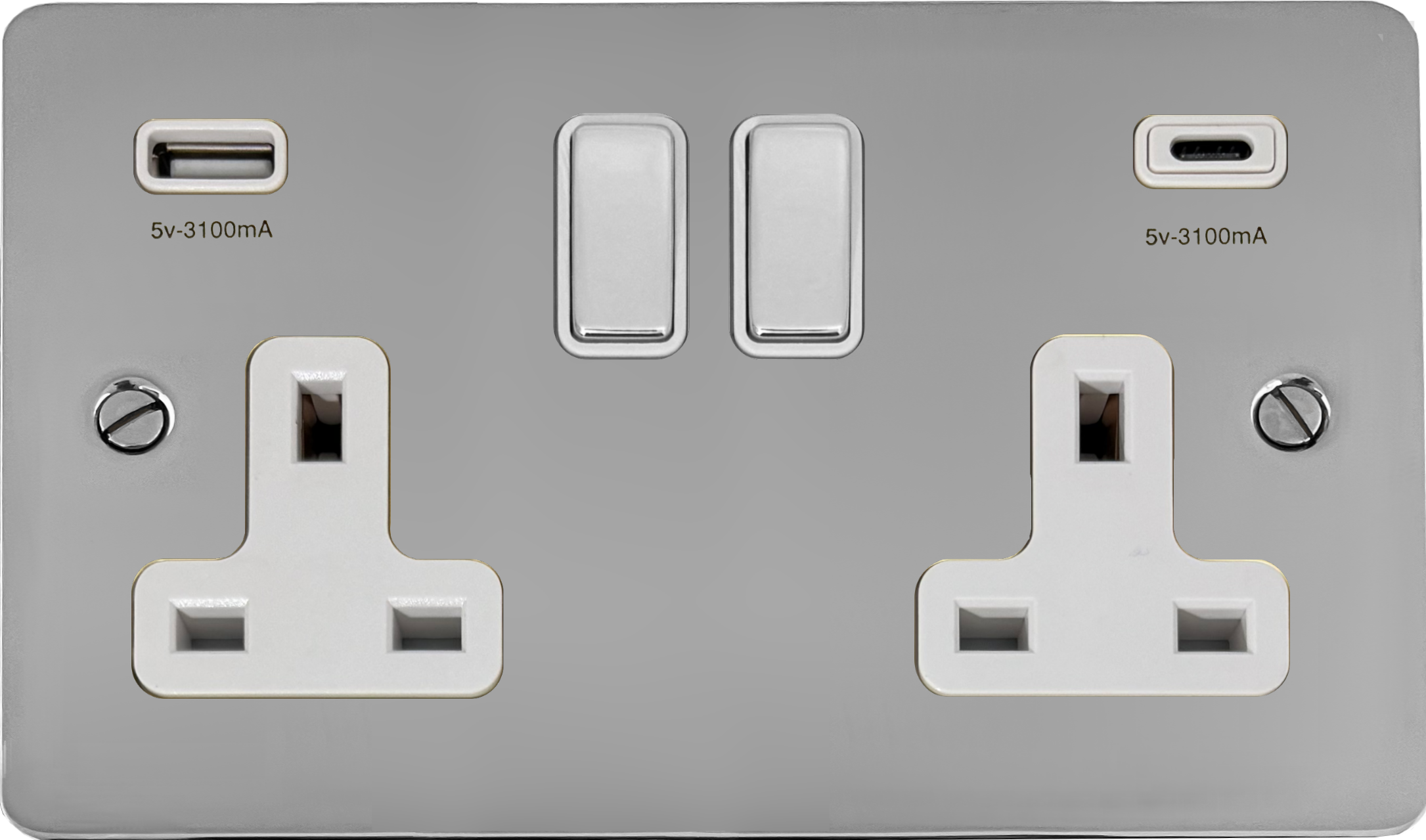 Flat Polished Chrome Double Socket with USB (USB-A and USB-C/White Insert/Chrome Switches) FL.2911.C