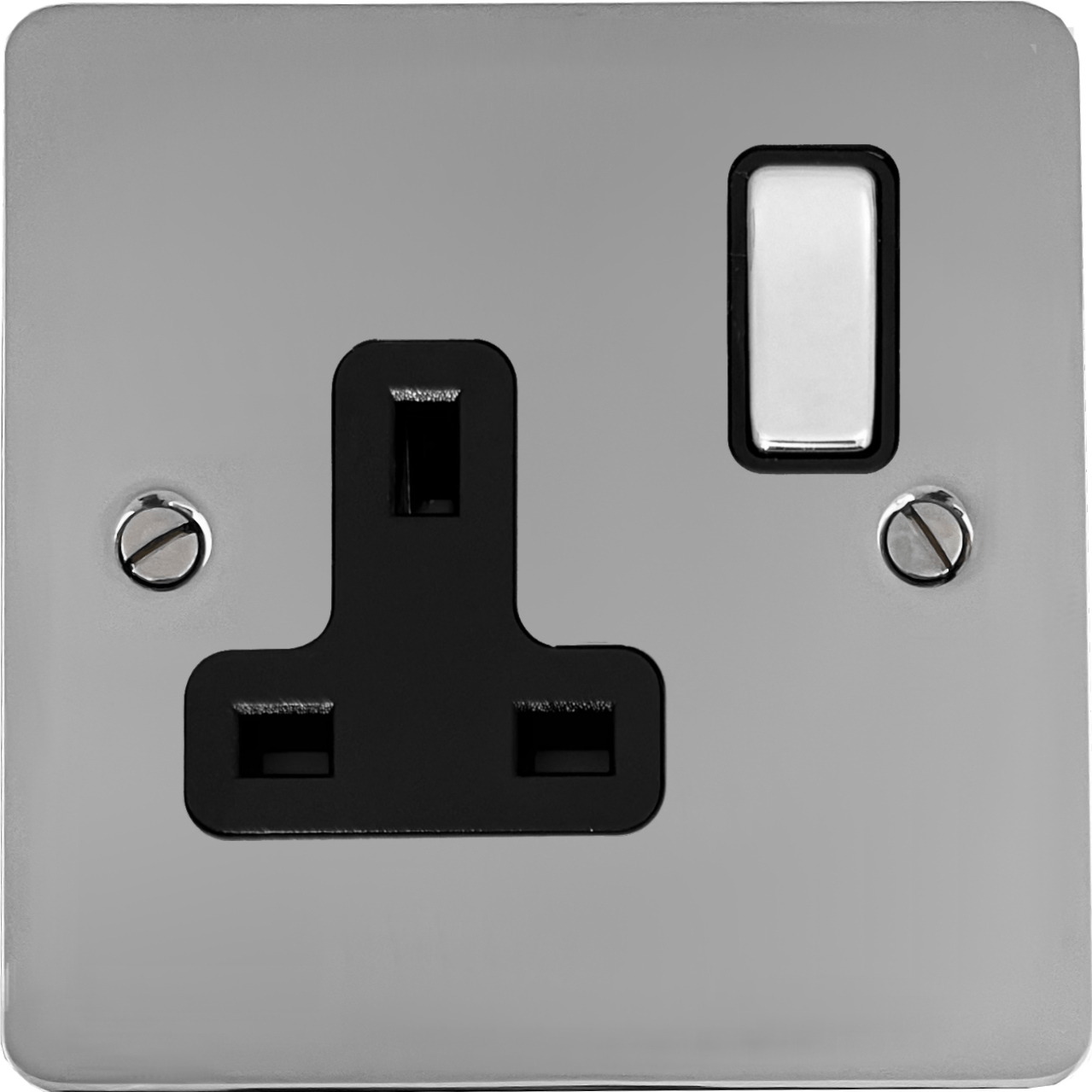 The socket is 13amp and is a double pole socket. It is fixed to a polished chrome flat plate plug socket. The socket insert and switch surround are both black plastic.