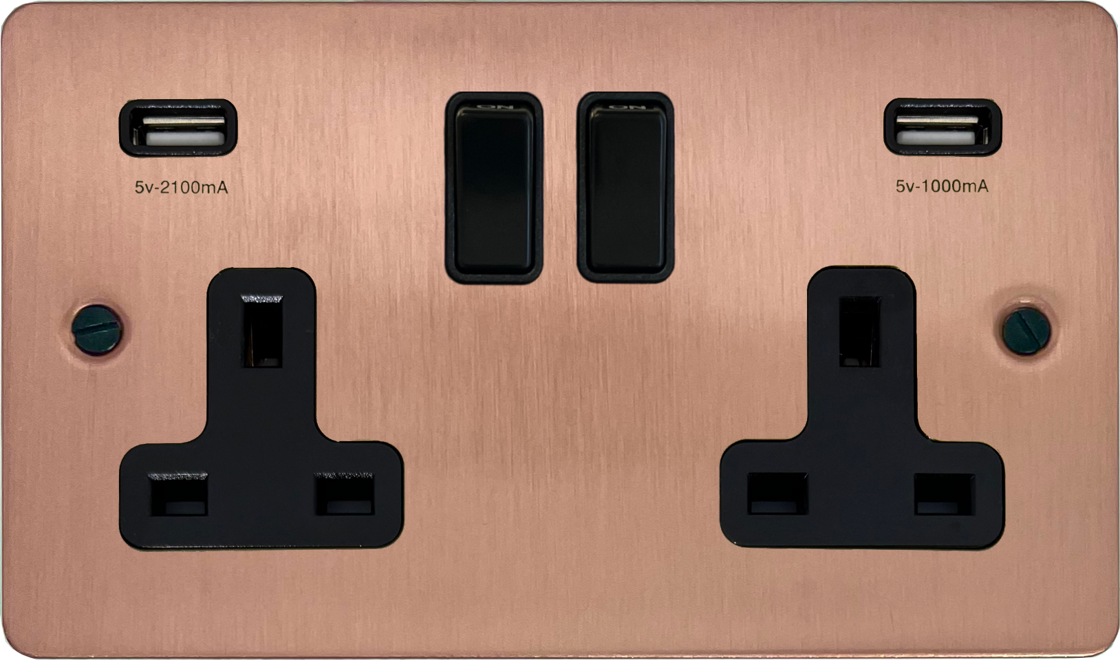 Flat Rose Gold Double Socket with USB (Black Switch) - FRG910B