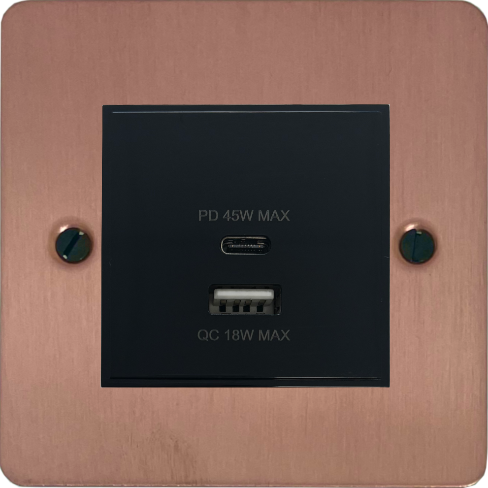 Flat Rose Gold USB Charger (Dual USB A + C Quick Charge) (1 Gang/Black Insert) - FRG43B