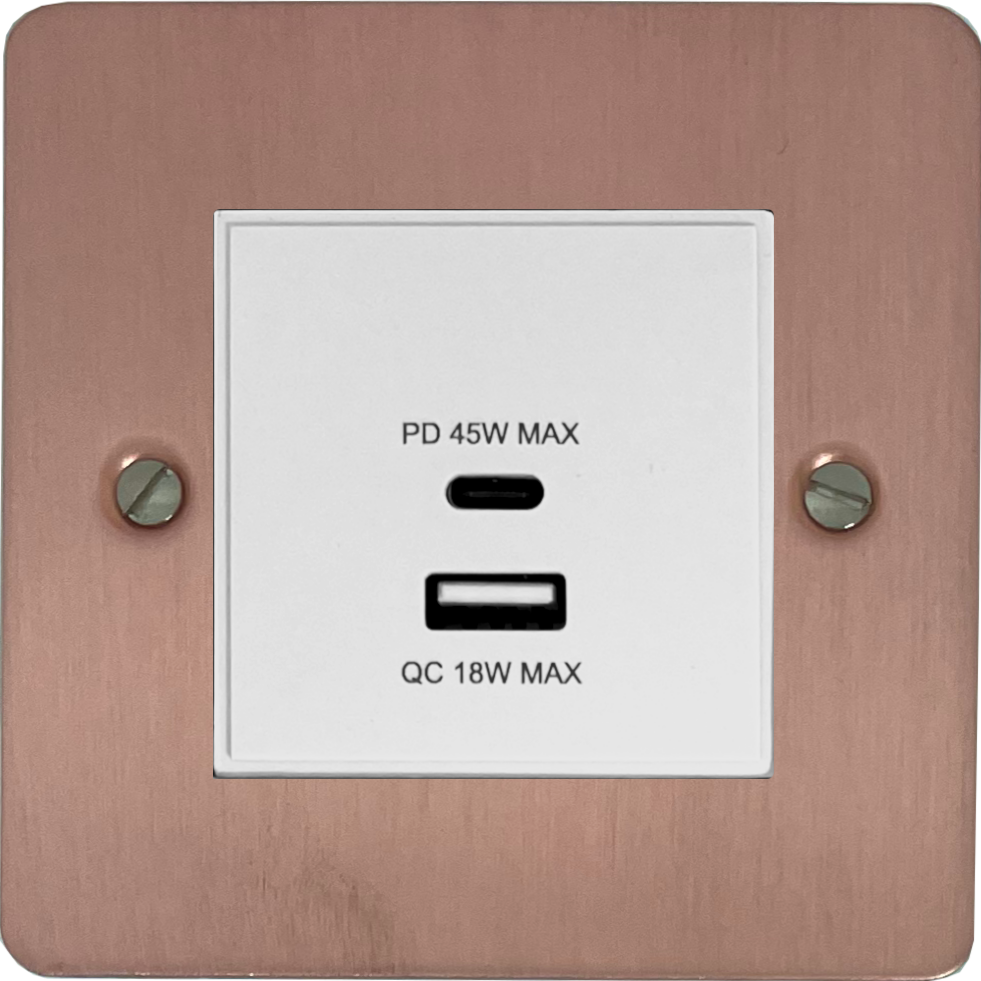 Flat Rose Gold USB Charger (Dual USB A + C Quick Charge) (1 Gang/White Insert) FL.43W.RG
