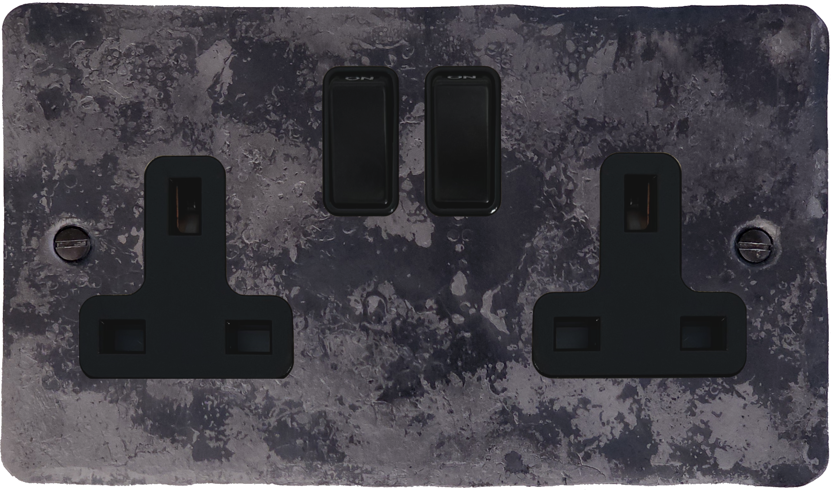 This is a 2 Gang 13A Switched Socket with Black inserts and a Black switch on a flat rustic plate.