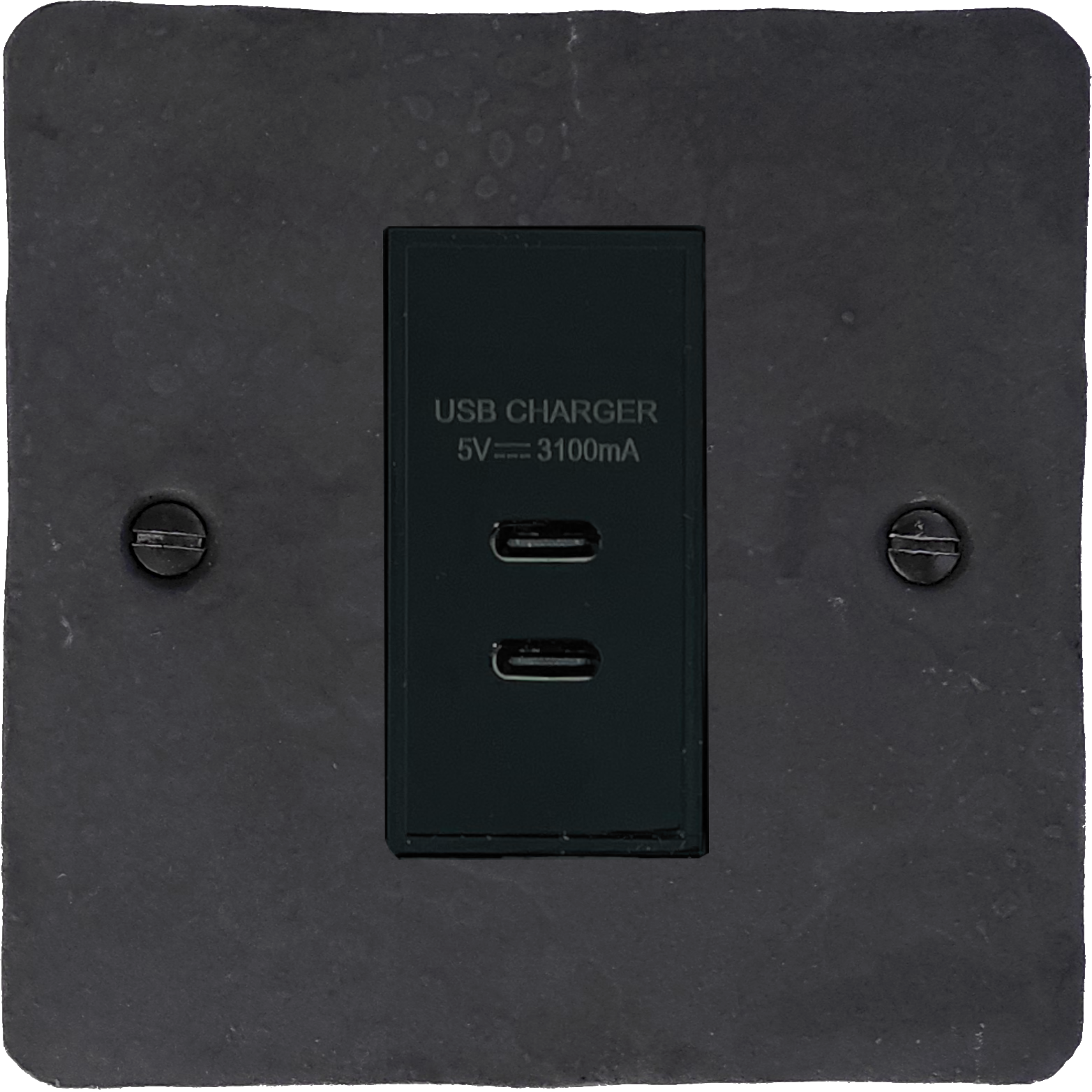 Flat Rustic Pewter USB Charger (2x USB-C) (1 Gang/Black Insert) FL.42B.RP
