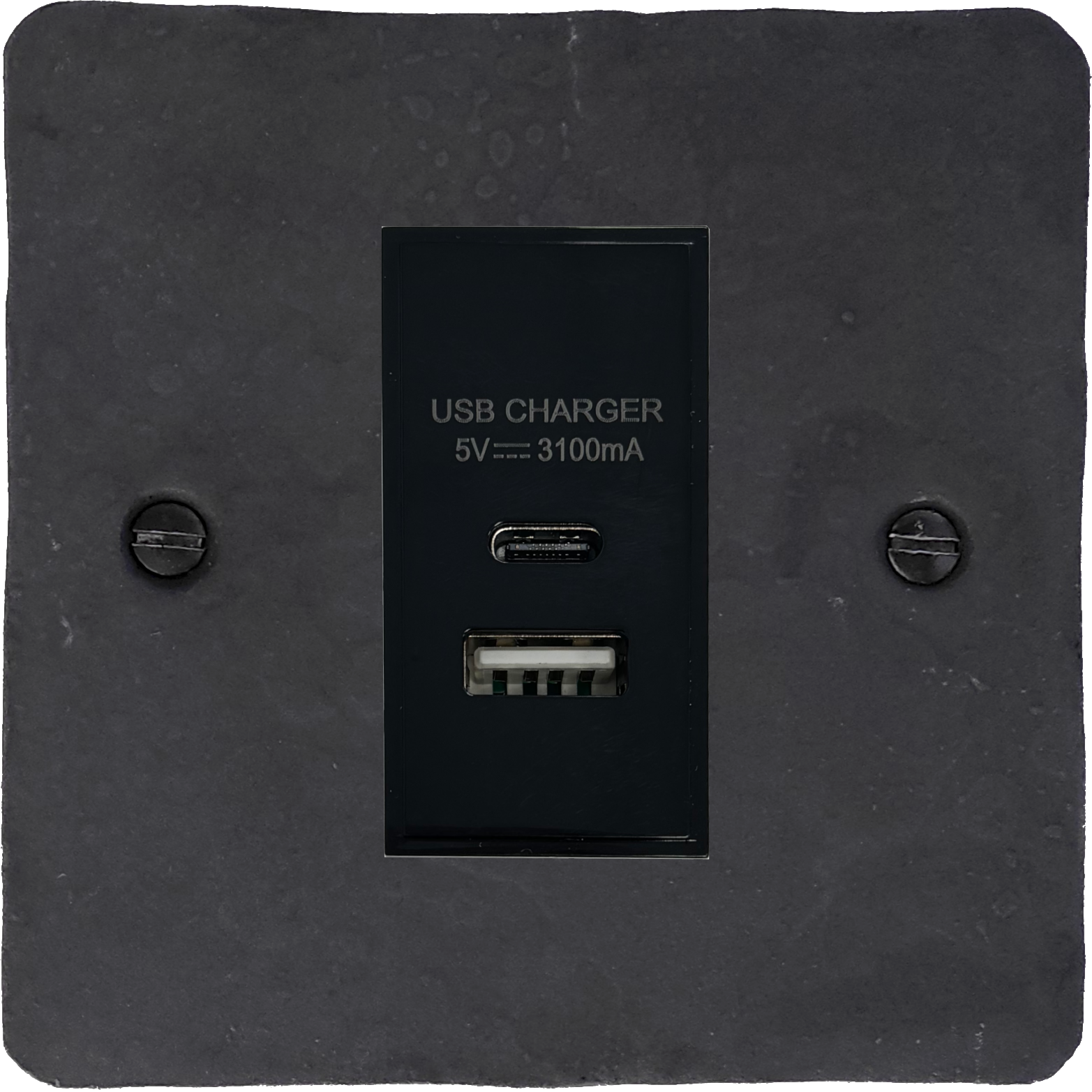 Flat Rustic Pewter USB Charger (USB-A and USB-C) (1 Gang/Black Insert) FL.41B.RP