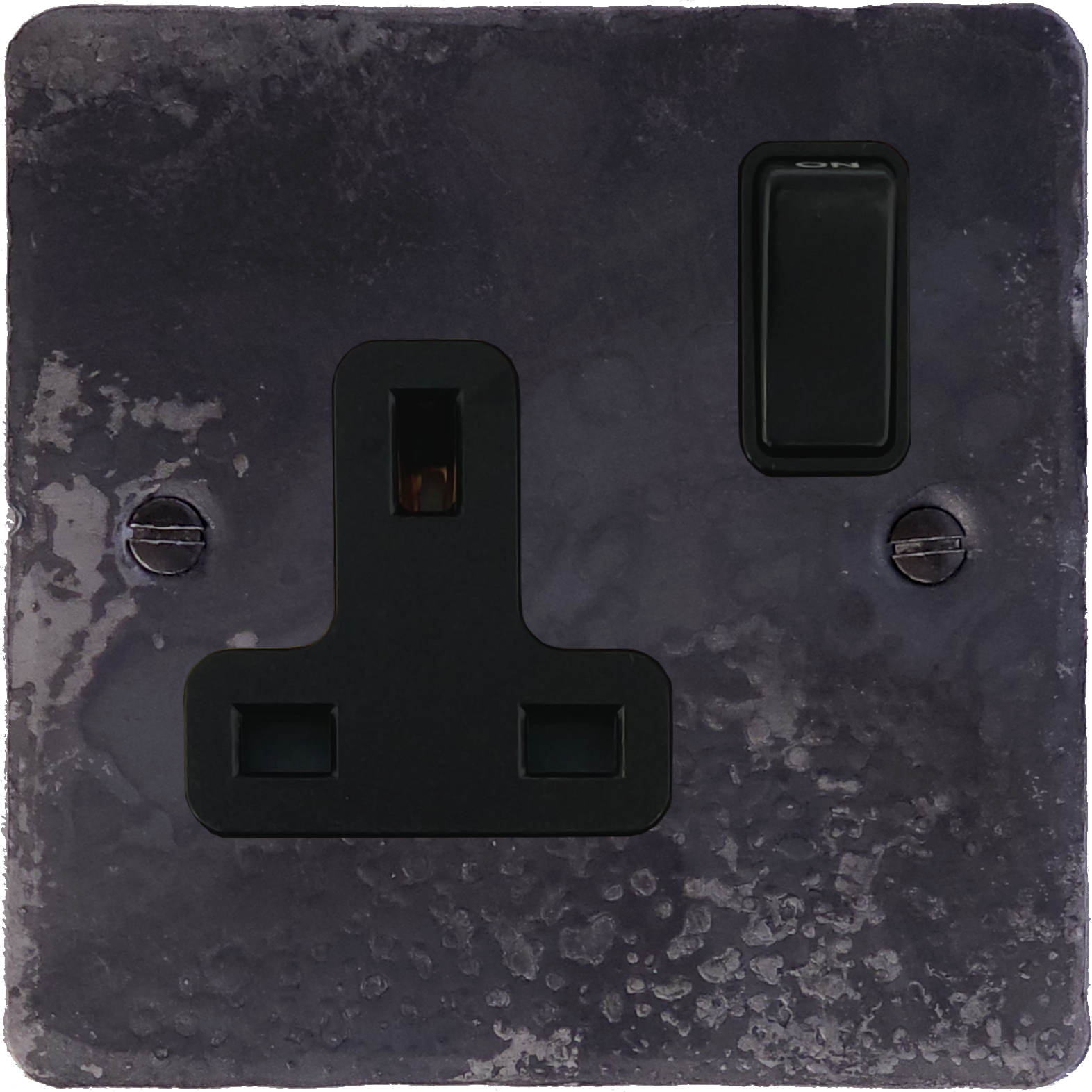 This is a 1 Gang 13A Switched Socket with black inserts and a black switch on a flat rustic plate.