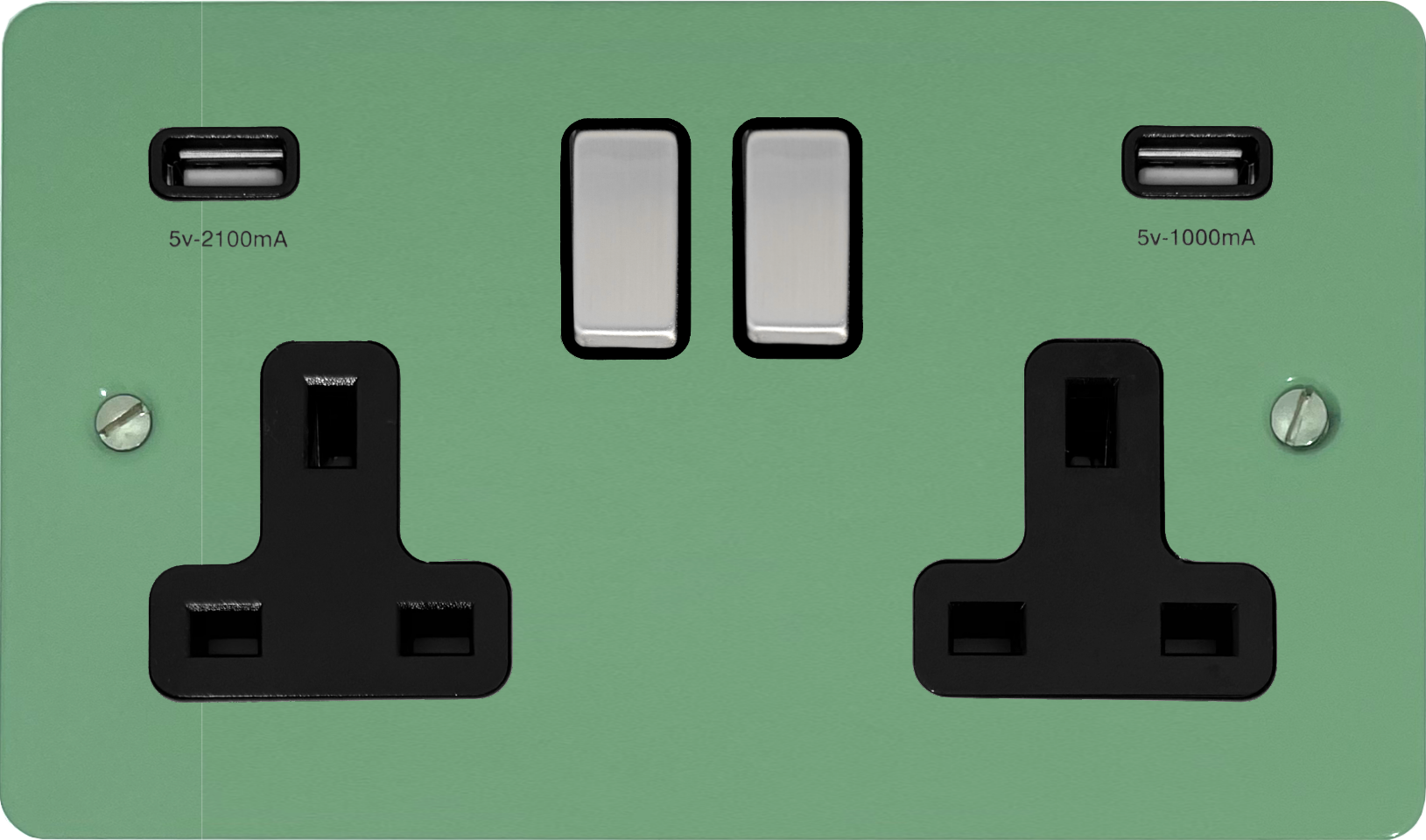 Flat Sage Green Double Socket with USB (Black Insert/Steel Switches) - FSG3910-SC
