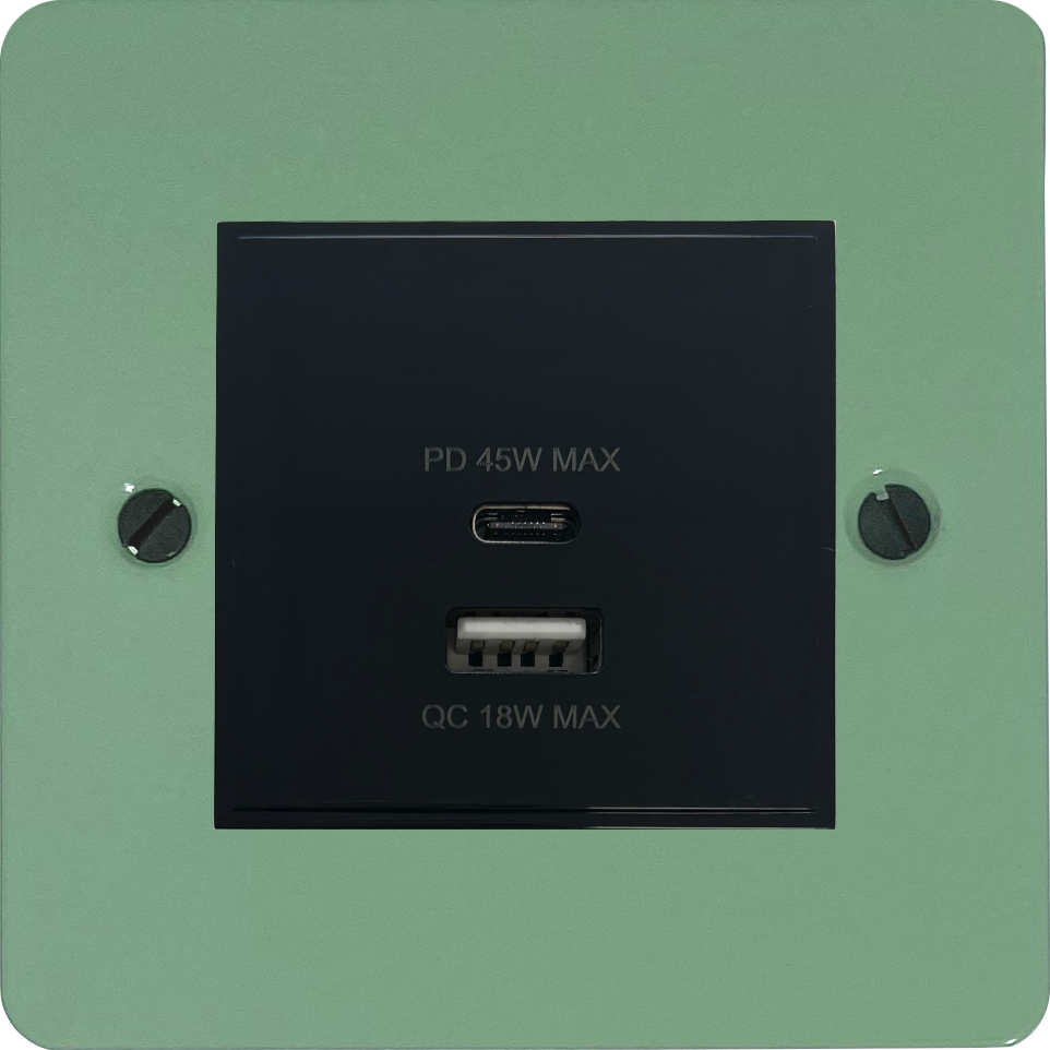 Flat Sage Green USB Charger (Dual USB A + C Quick Charge) (1 Gang/Black Insert) FL.43B.SG