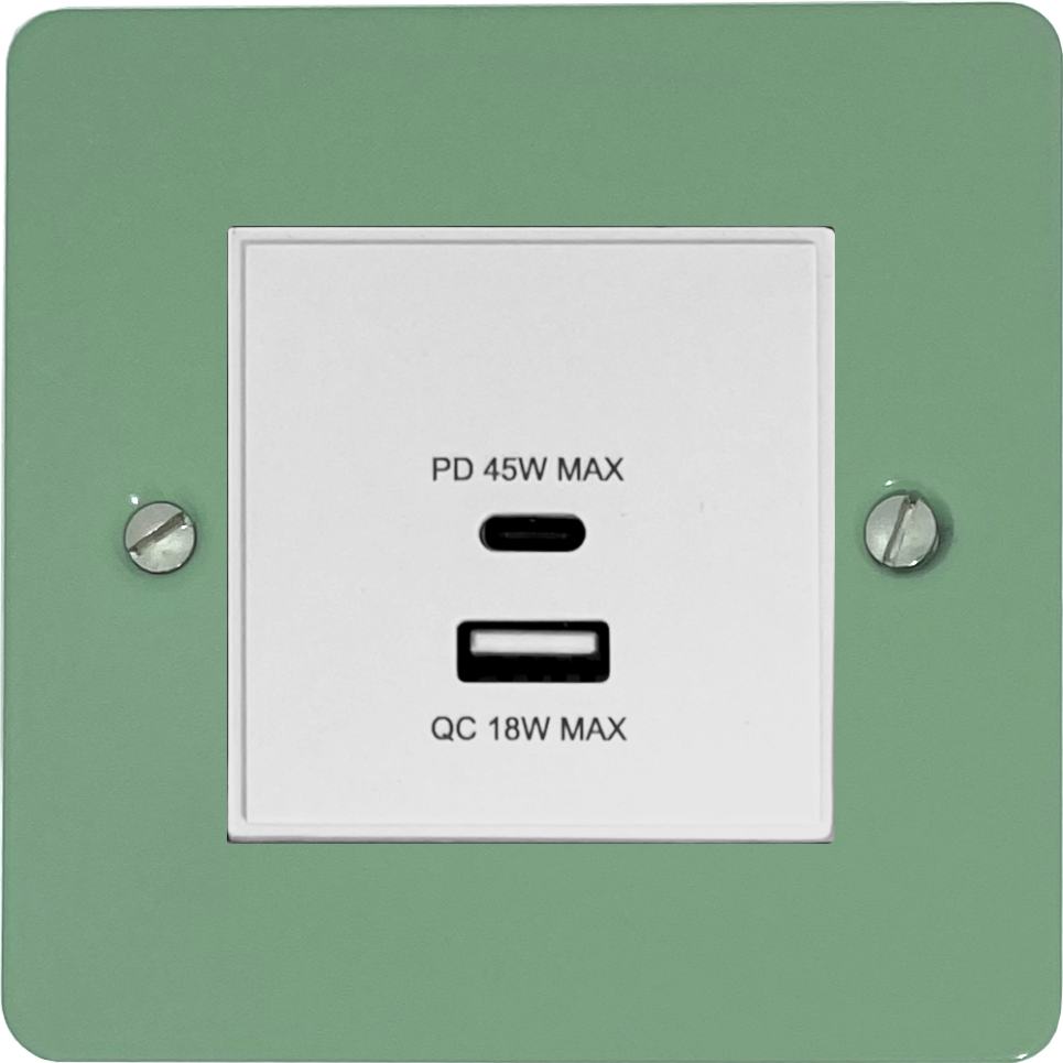Flat Sage Green USB Charger (Dual USB A + C Quick Charge) (1 Gang/White Insert) - FSG43W