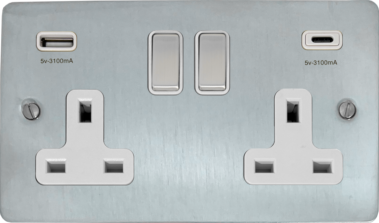 Flat Satin Chrome Double Socket with USB (2 Gang/USB-A and USB-C/White Inserts/Satin Chrome Switches) FL.2911.SC