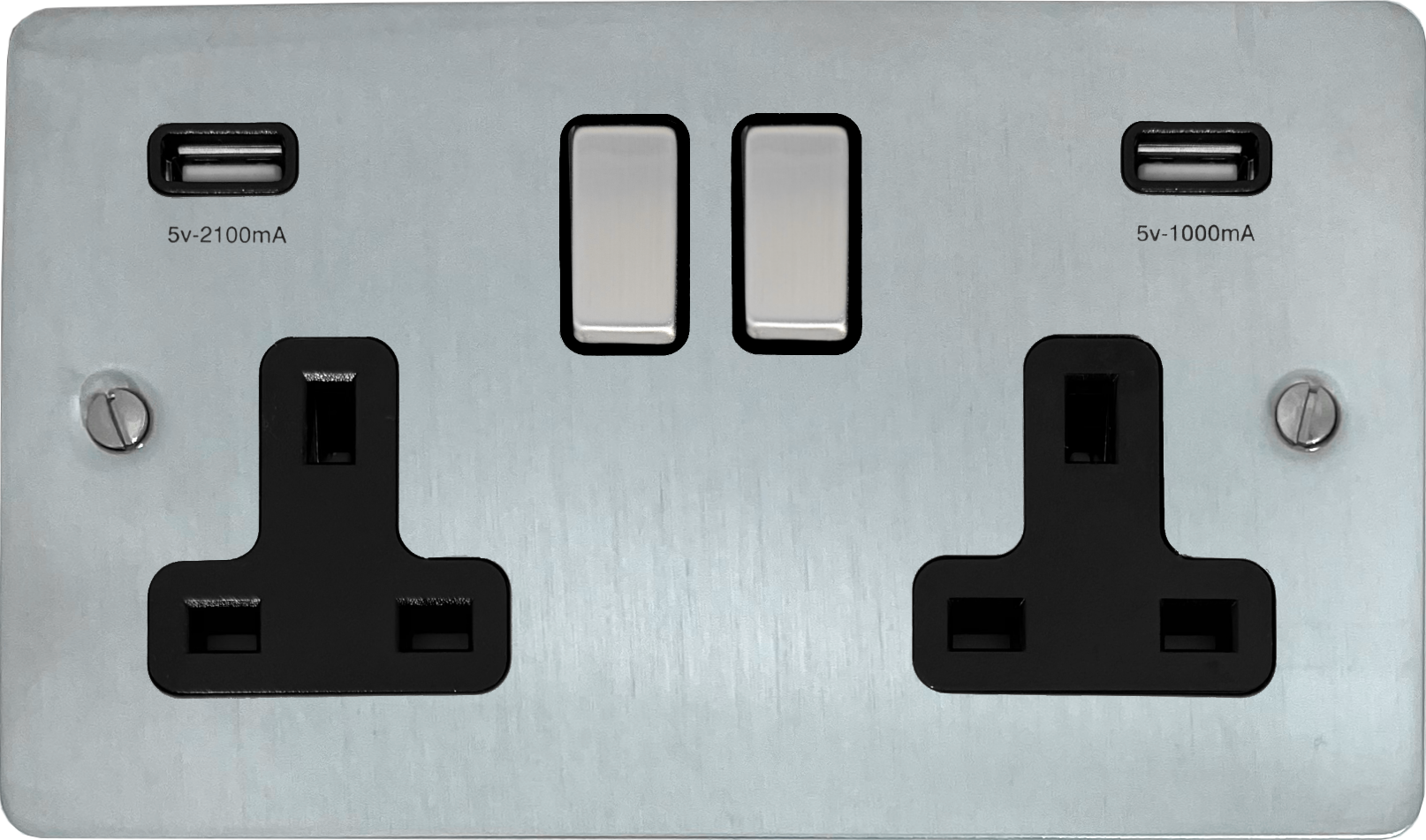 Flat Satin Chrome Double Socket with USB (Black Insert/Satin Chrome Switches) FL.3910.SC