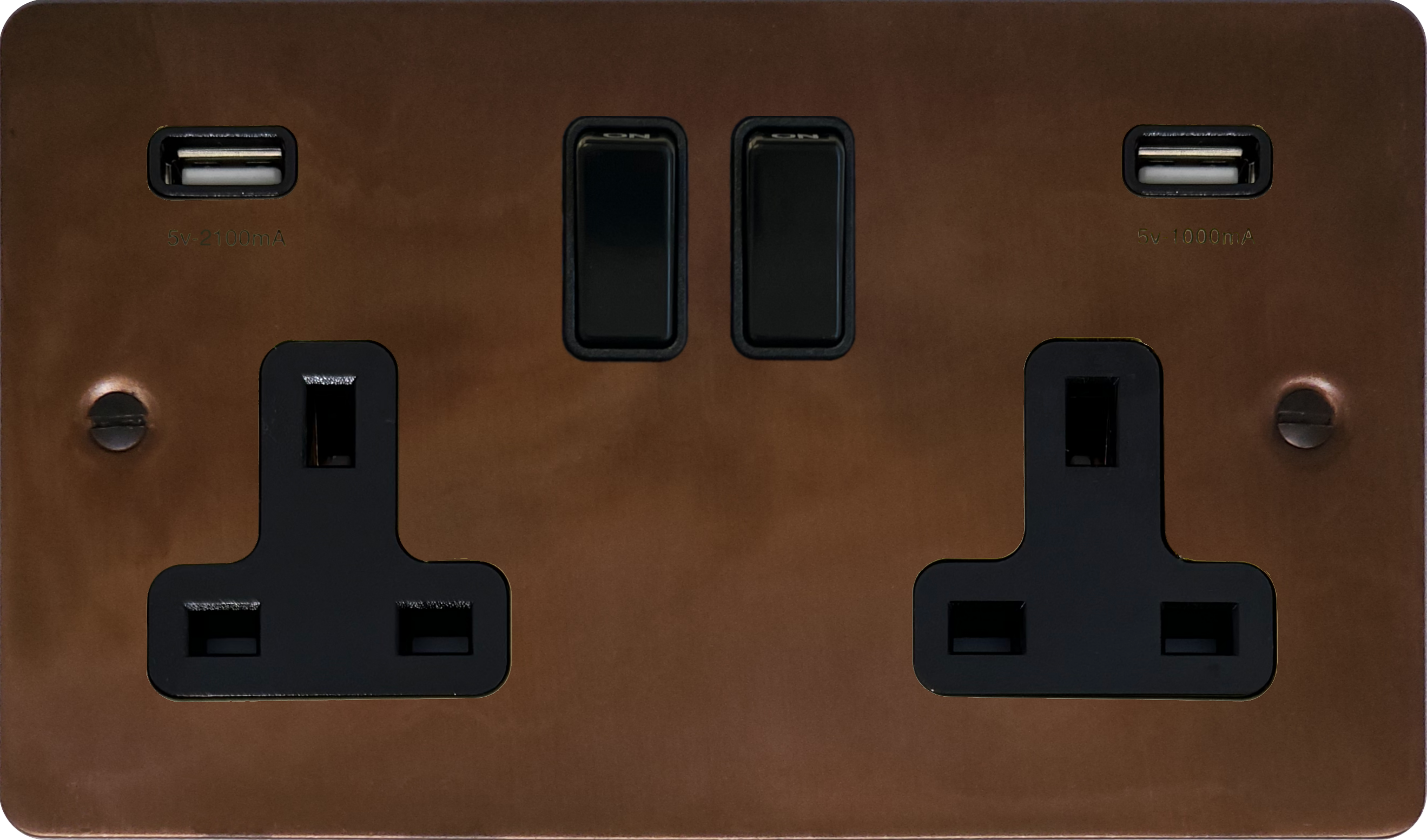 Flat Tarnished Copper Double Socket with USB (Black Switch) - FTC910B
