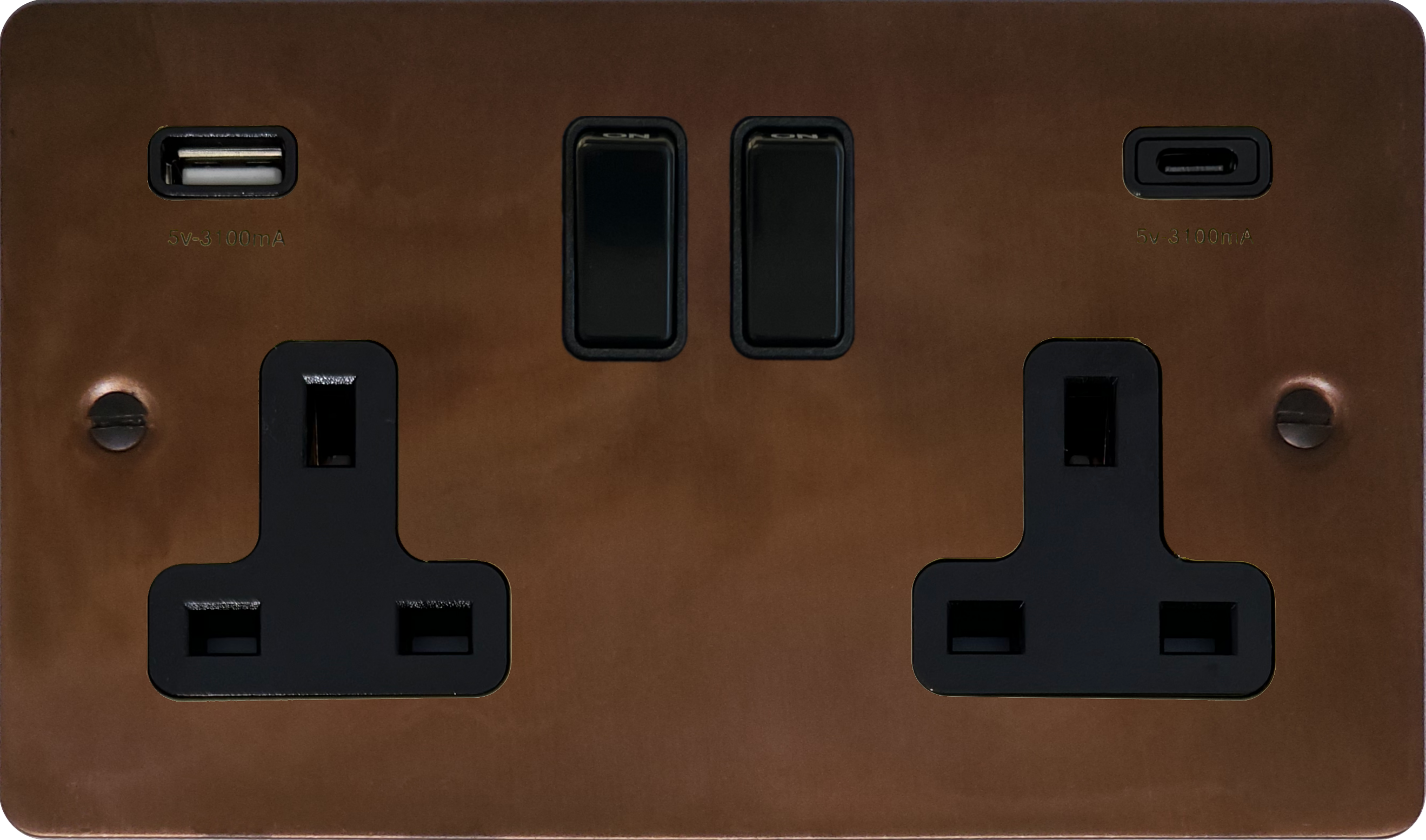 Flat Tarnished Copper Double Socket with USB (USB-A and USB-C/Black Switches) FL.911B.TC