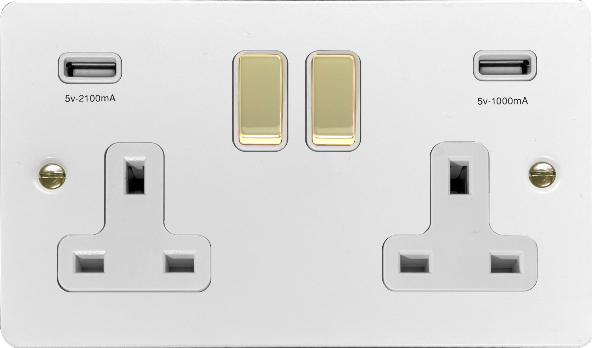 Flat White Socket with USB (Double Socket/Polished Brass Switches) FL.2910PB.W