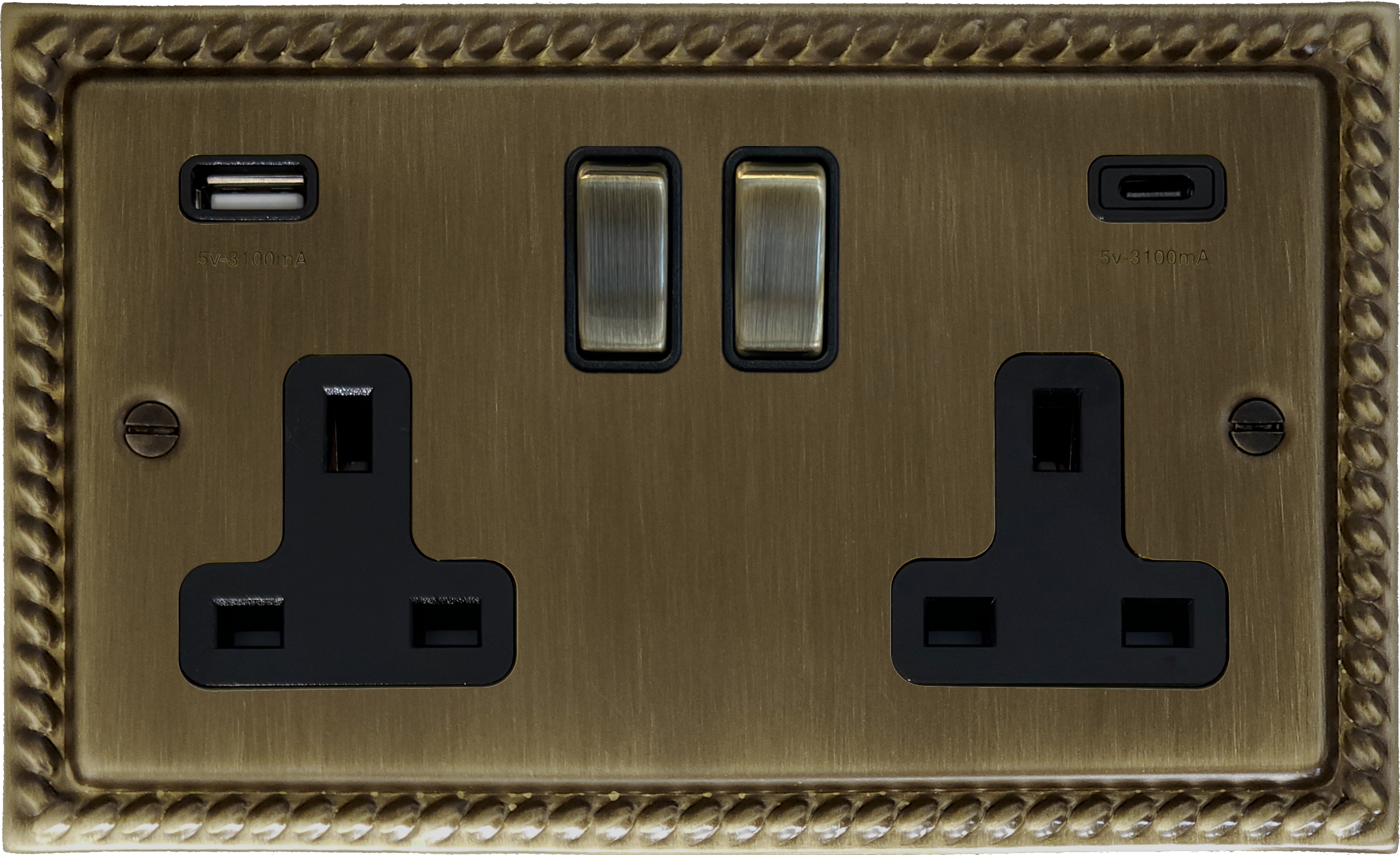 Georgian Antique Brass Socket with USB (2 Gang/USB-A and USB-C) GE.3911.AB