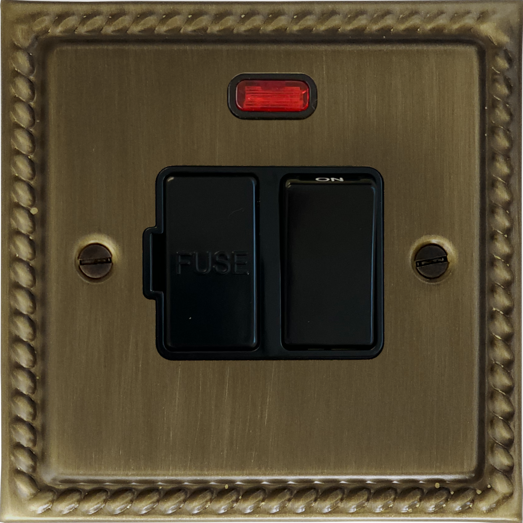 Georgian Antique Brass Switched Fused Spur with Neon (Black Switches) GE.27B.AB