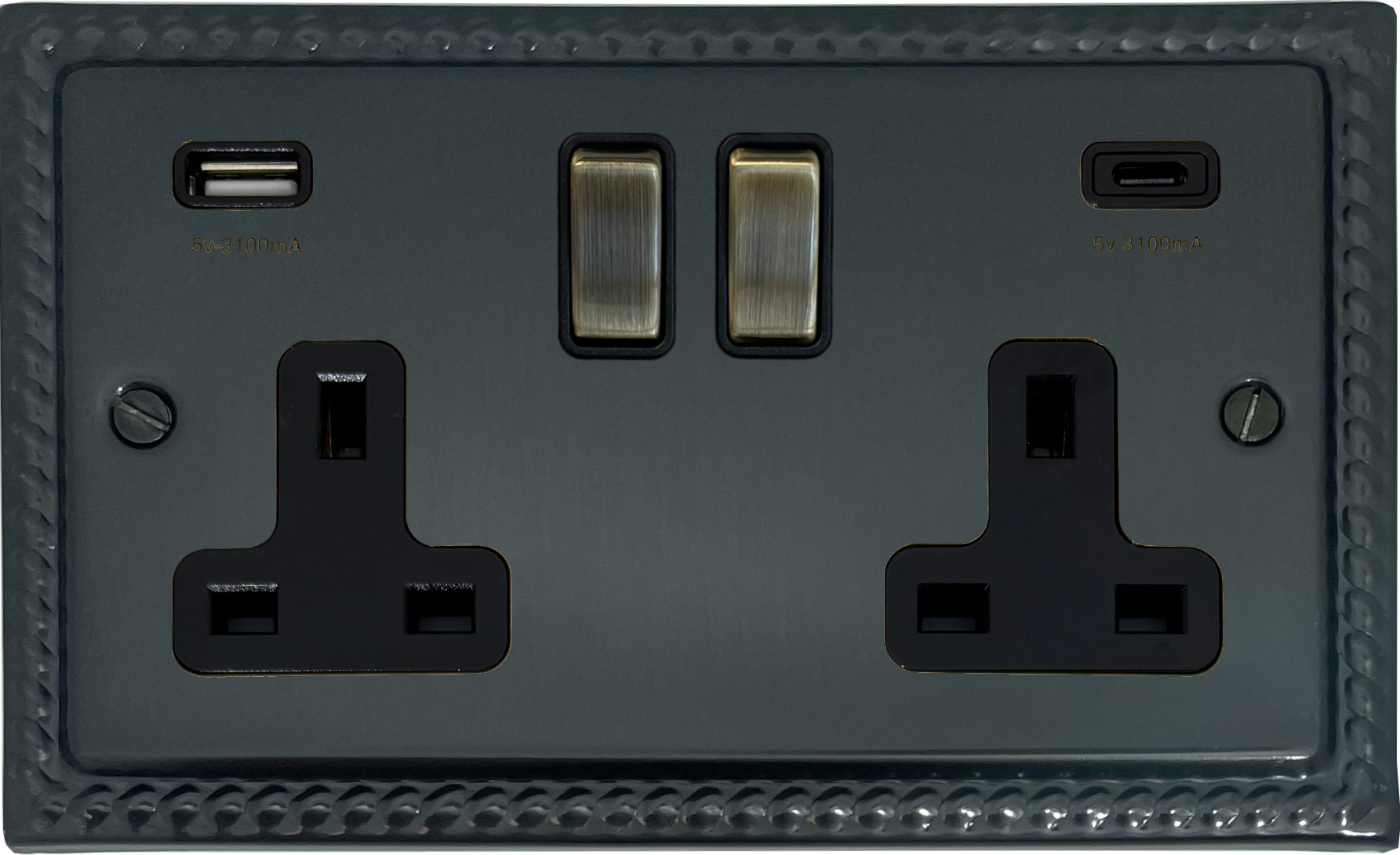 Georgian Black Bronze Socket with USB (2 Gang/USB-A and USB-C/Antique Brass Switches) GE.3911AB.BB