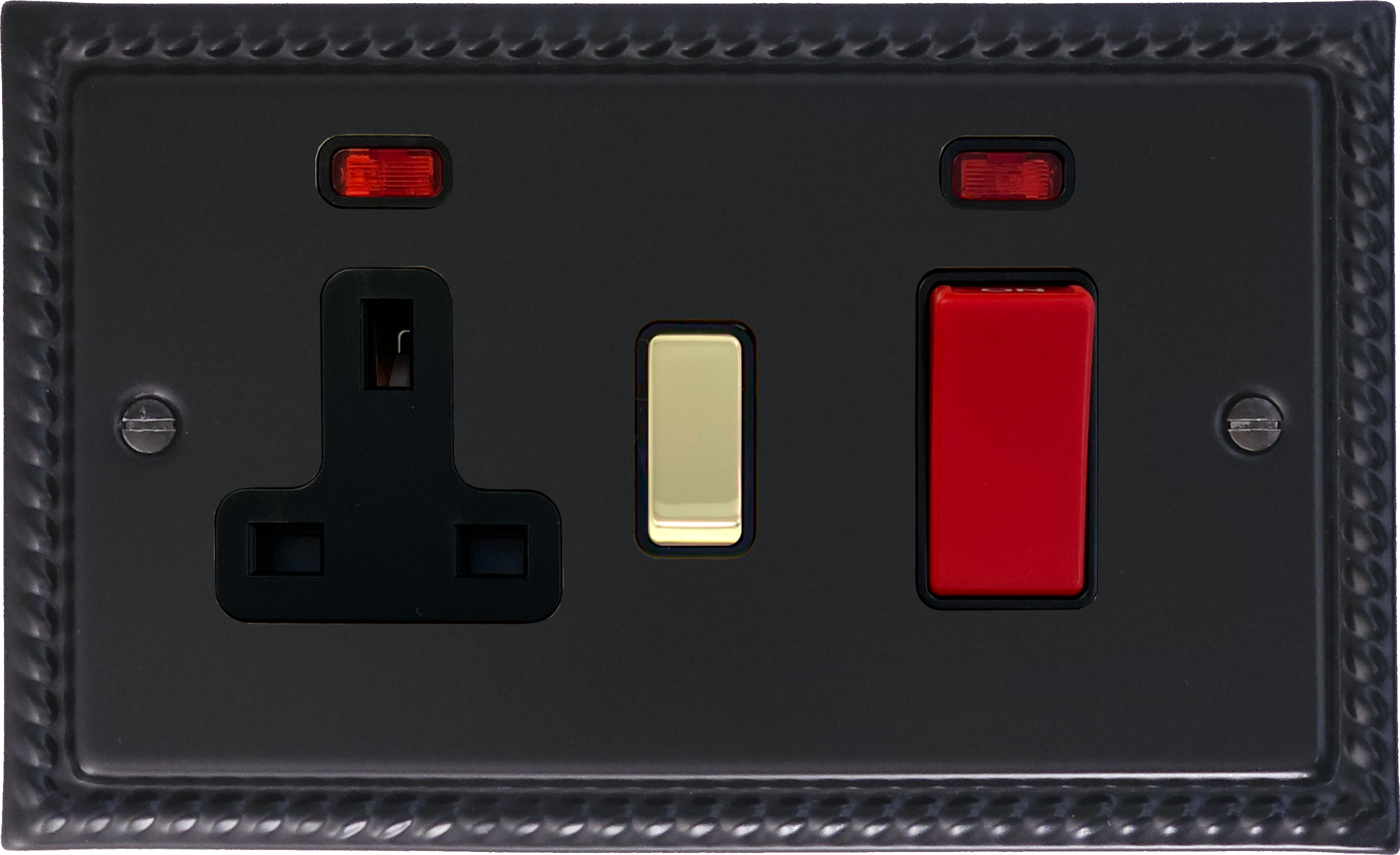 Georgian Black Cooker Switch with Socket (Black inserts/Red/Polished Brass Switch) GE.329PB.FB