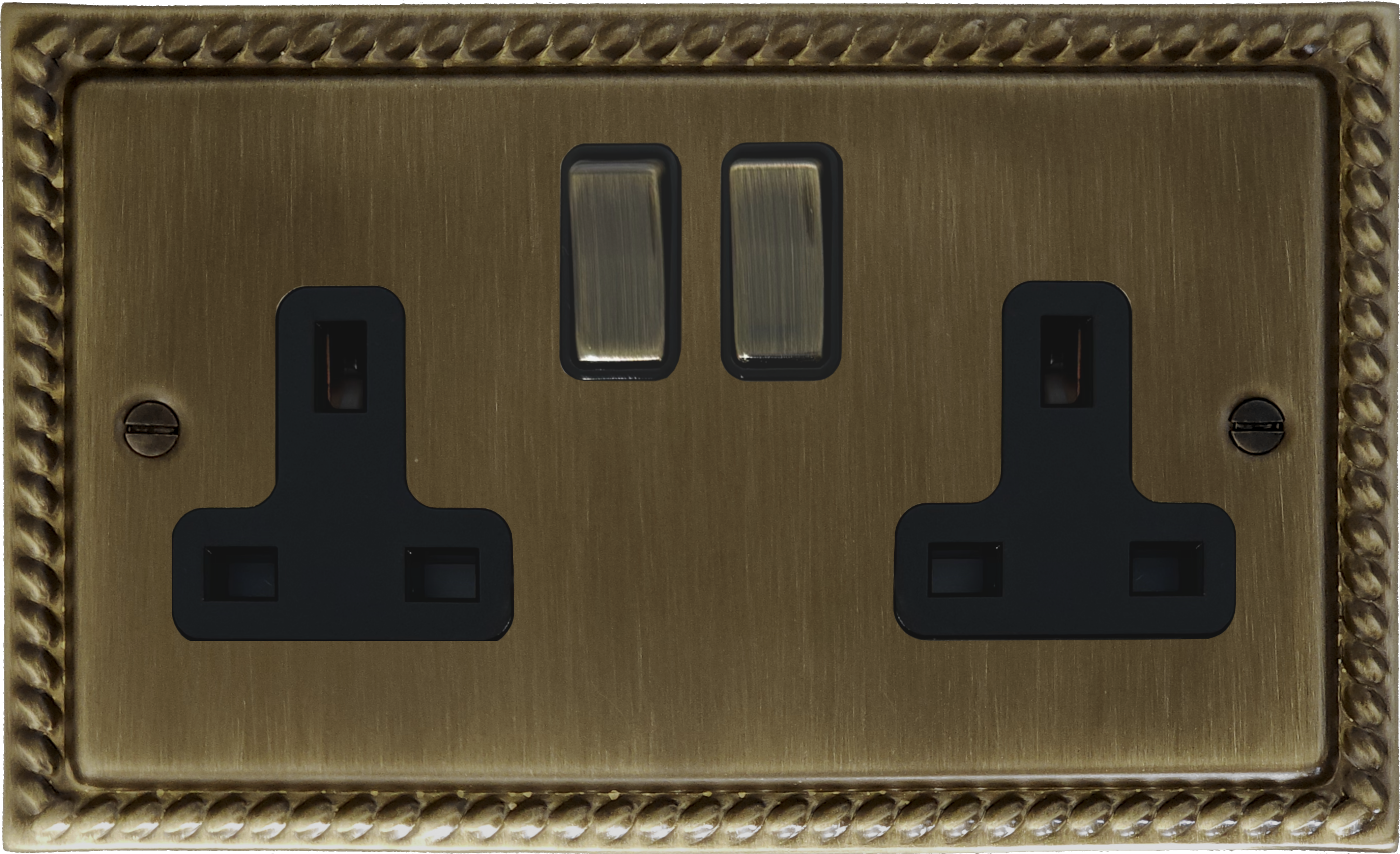 The socket has a rope edge and is made of brass with an antique brass finish. The socket plates are then lacquered for further protection. The rocker switches are also antique brass with black surrounds.