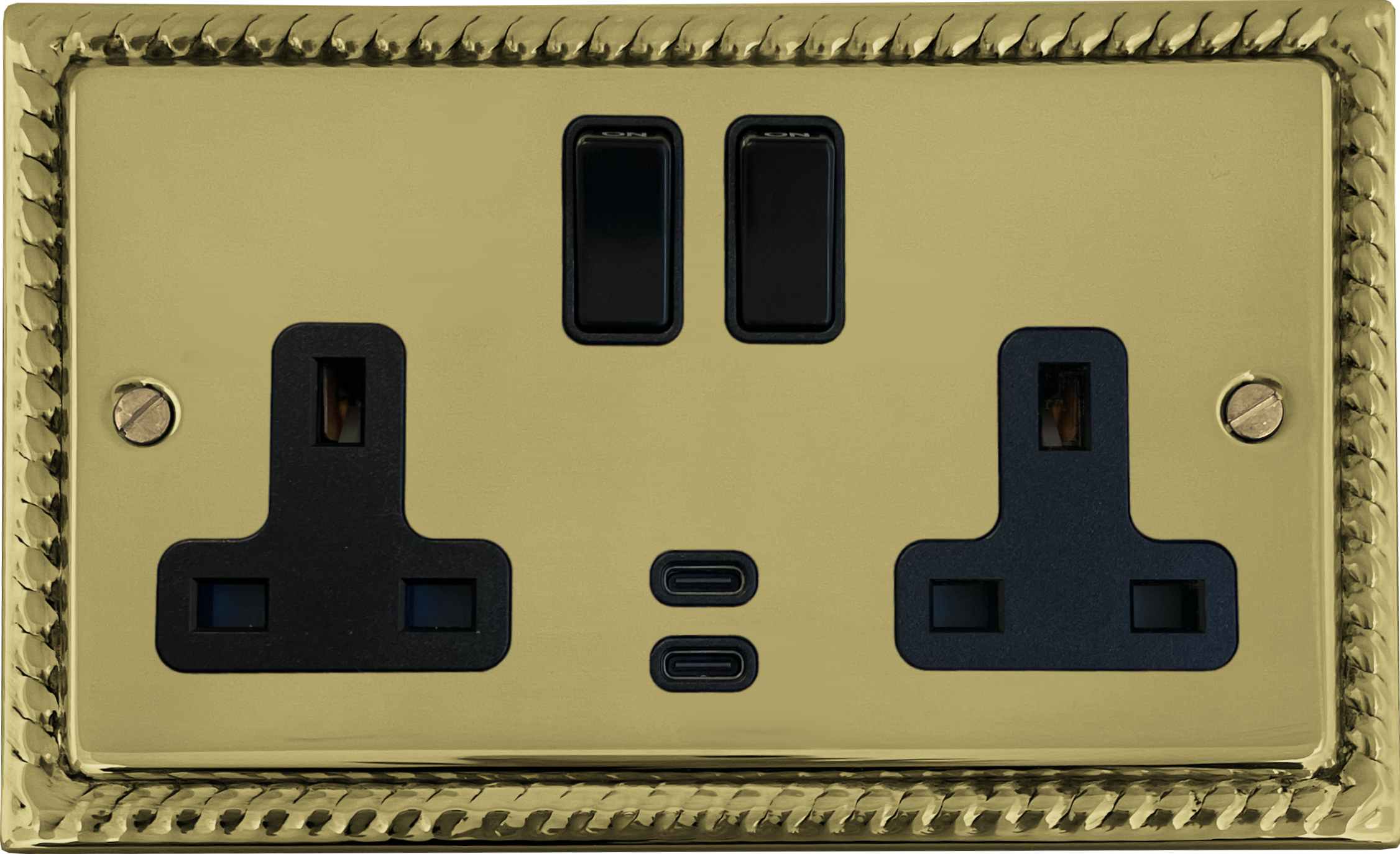 Georgian Polished Brass Double Socket with USB (USB-C/Black Switches) GE.913B.B