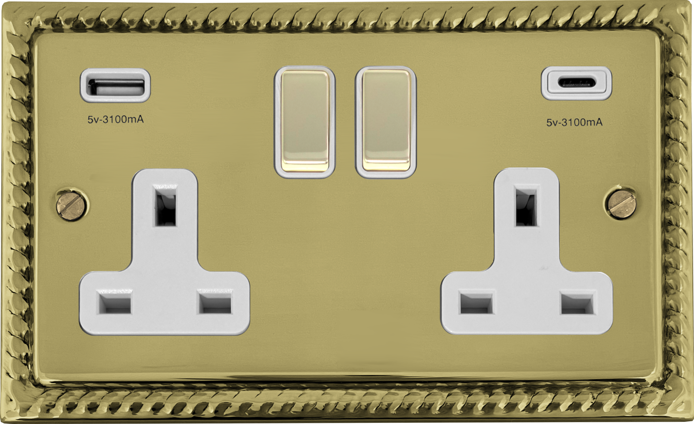 Georgian Polished Brass Double Socket with USB (USB-A and USB-C/White Inserts Brass Switches) - MB2911