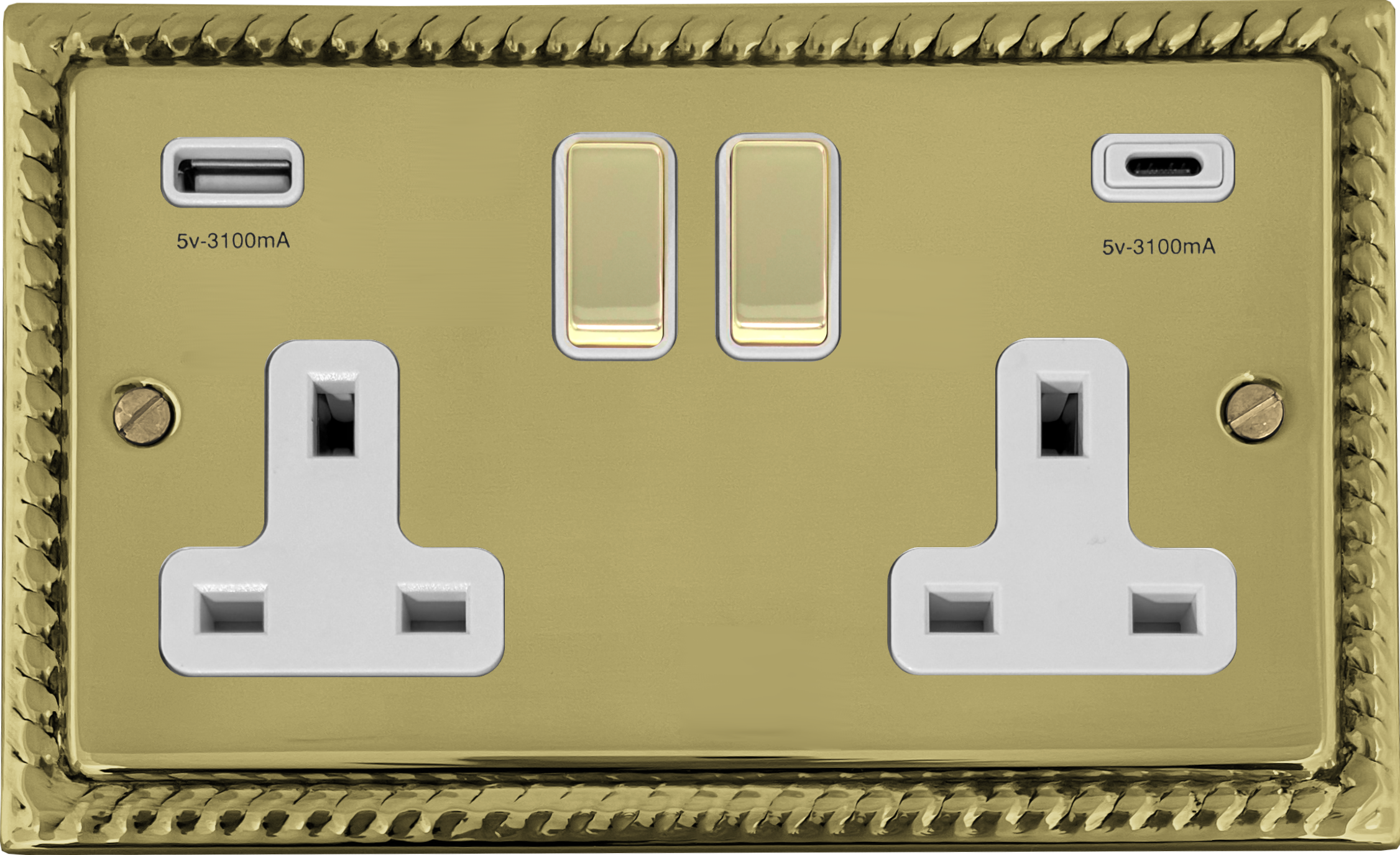 Georgian Polished Brass Double Socket with USB (USB-A and USB-C/White Inserts Brass Switches) GE.2911.B