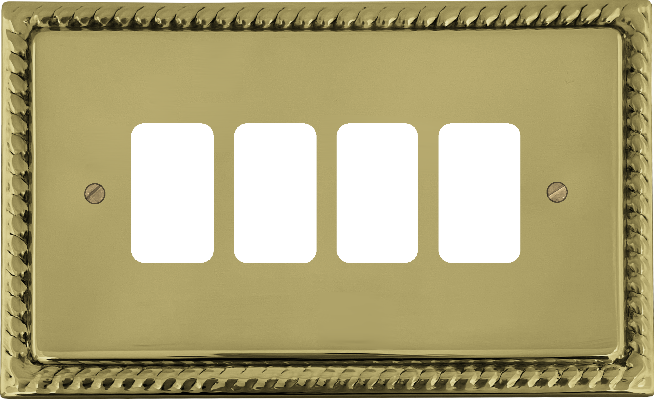 This is a 4 gang polished brass grid switch plate. It is in a Georgian (rope-edged) style of plate.