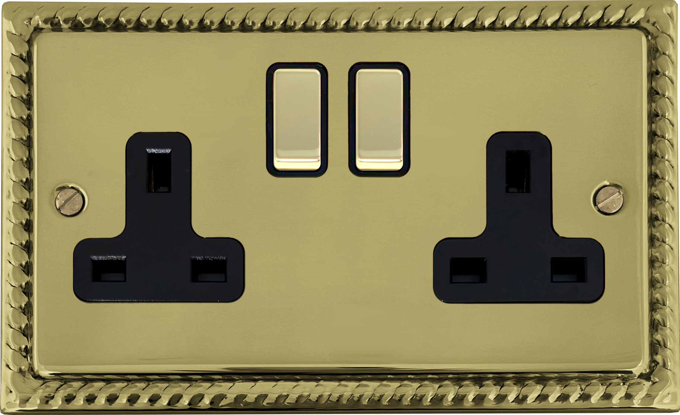 It has a matching brass switches with black plastic surrounds. The plate is polished brass with a rope effect on the edge. It is made in Britain and comes with a 10 years' warranty. This socket is part of the full range of Georgian polished brass sockets and switches, available online today.
