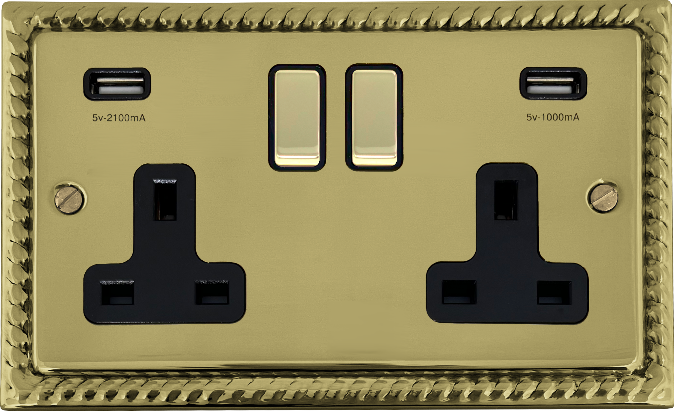 It has brass switches with black plastic inserts and USB sockets. The sockets are suitable for charging phones and tablets, leaving the sockets free for other appliances.