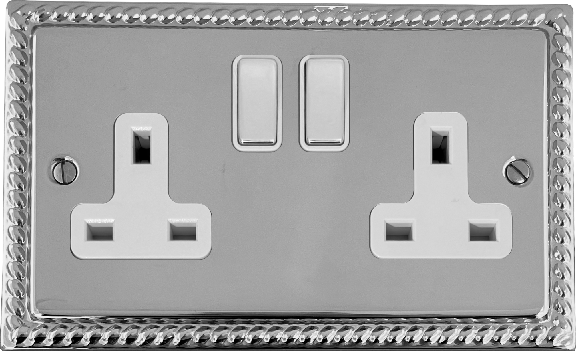This is a polished chrome double socket with a Georgian rope edged finished. It has polished chrome switches with white plastic surrounds.