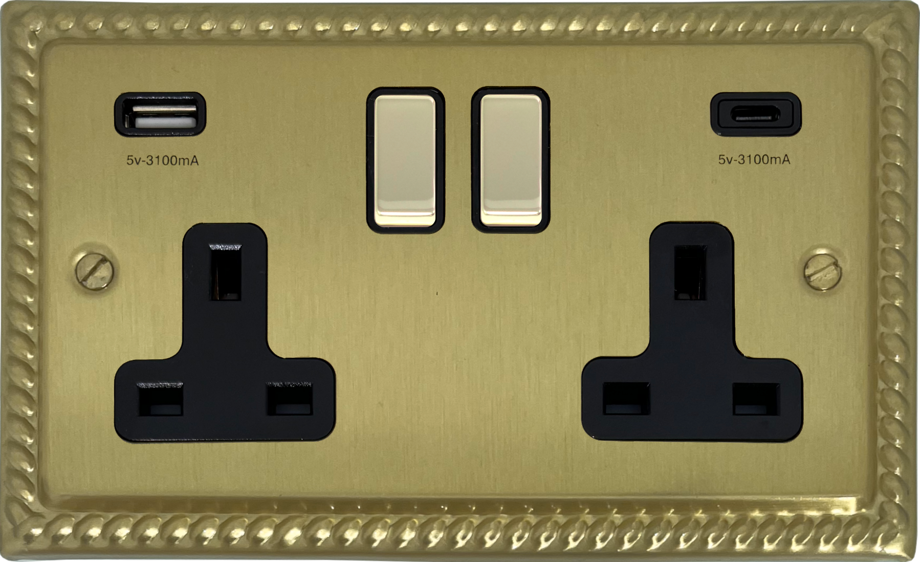 Georgian Satin Brass Double Socket with USB (USB-A and USB-C/Black Inserts Brass Switches) - MSB3911