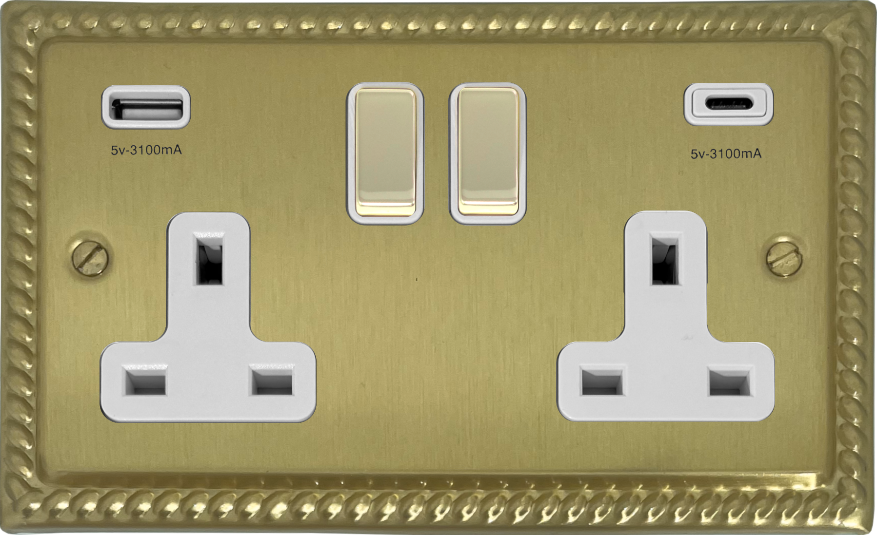 Georgian Satin Brass Double Socket with USB (USB-A and USB-C/White Inserts Brass Switches) - MSB2911