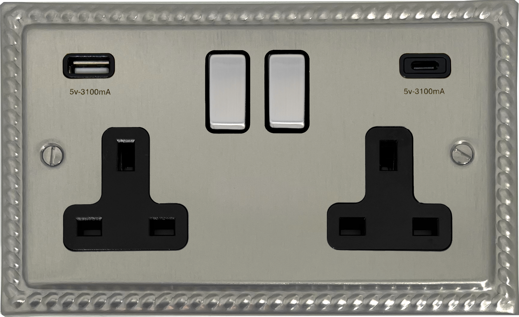 Georgian Satin Nickel Double Socket with USB (USB-A and USB-C/Black Insert/Matching Switch) GE.3911.SN
