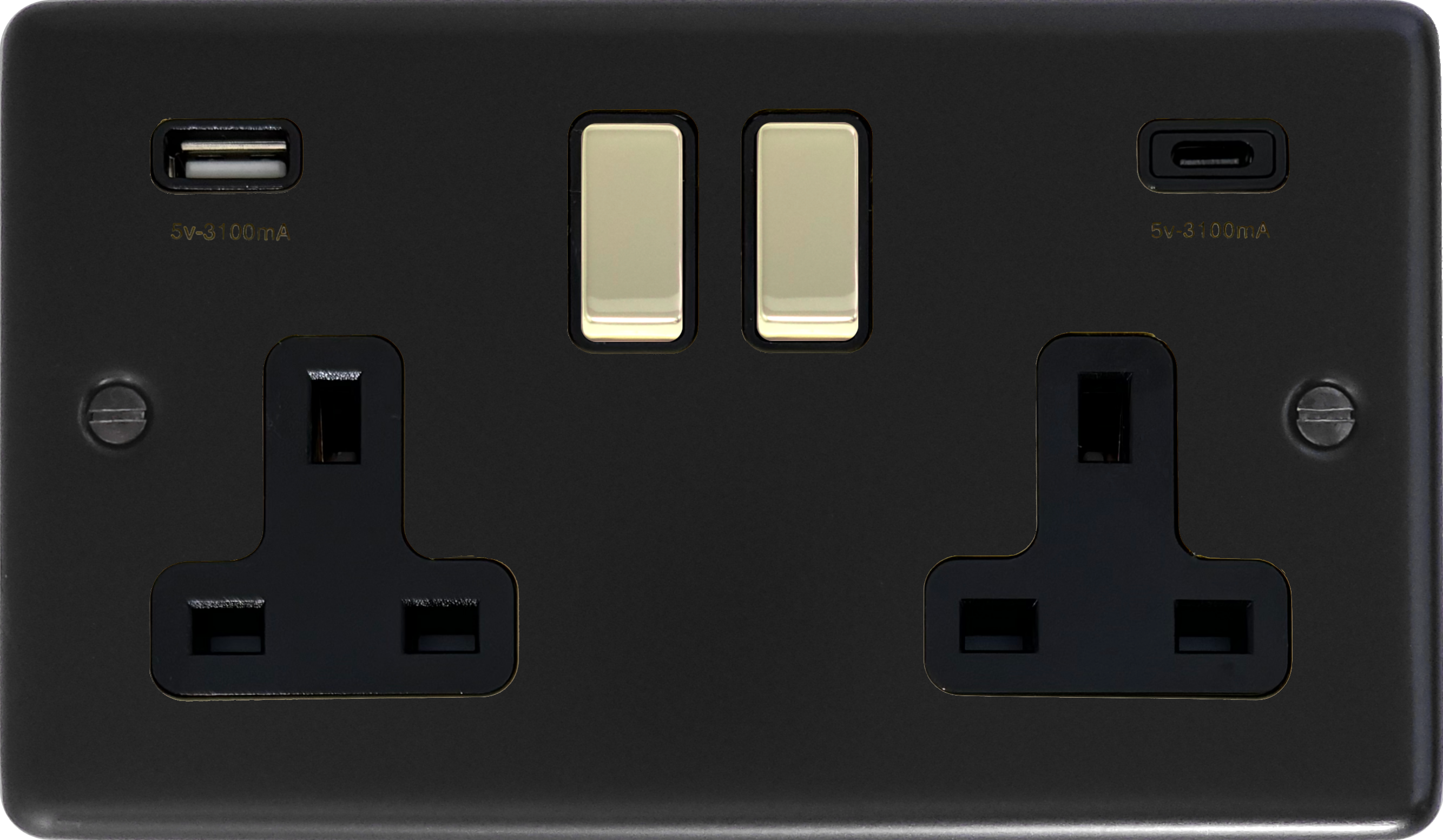 Matt Black Double Socket with USB (2 Gang/USB-A and USB-C/Polished Brass Switches) - CFB3911-PB