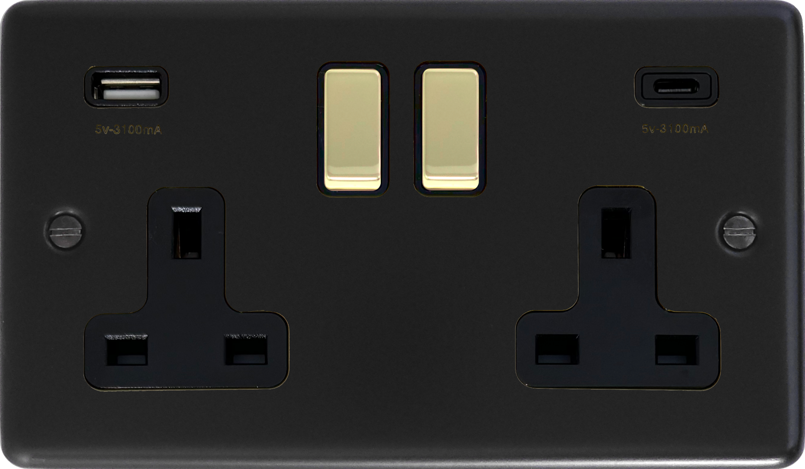 Matt Black Double Socket with USB (2 Gang/USB-A and USB-C/Polished Brass Switches) CL.3911PB.FB