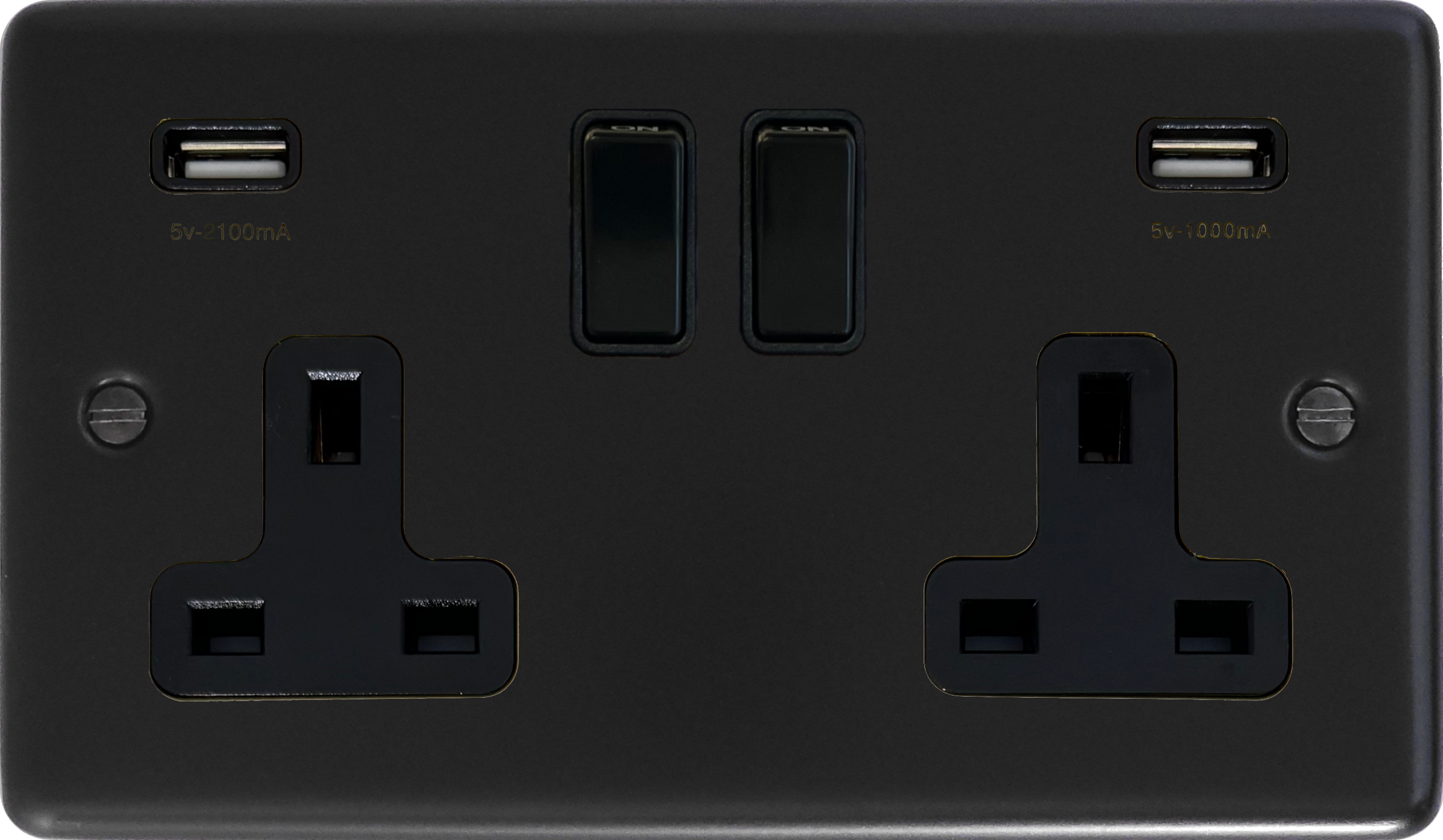 This item is a metal plate with a matt black powder coated finish. It is a double pole 13 amp double socket with two integrated USB charging ports.