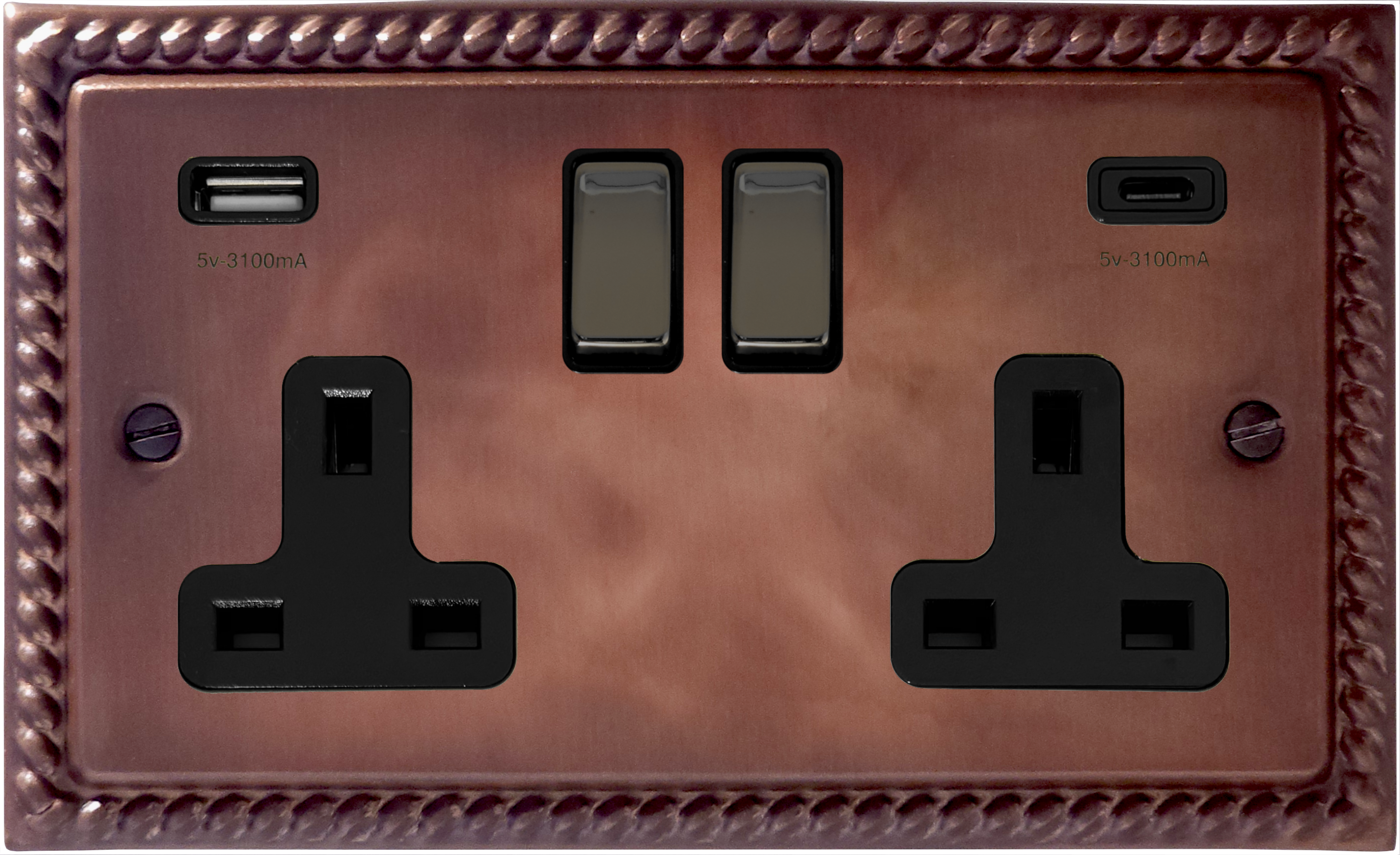 Monarch Tarnished Copper Double Socket with USB (USB-A and USB-C/Black Nickel Switches) GE.3911.TC